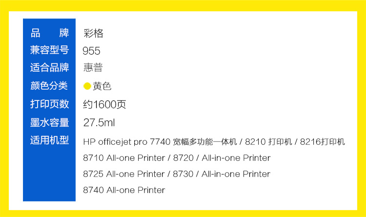 - 商品名称:彩格955XL墨盒黄色 适用惠普7720 7740 8210 8216 8218 8720 8725 8730 8740打印机 HP955打印机墨盒