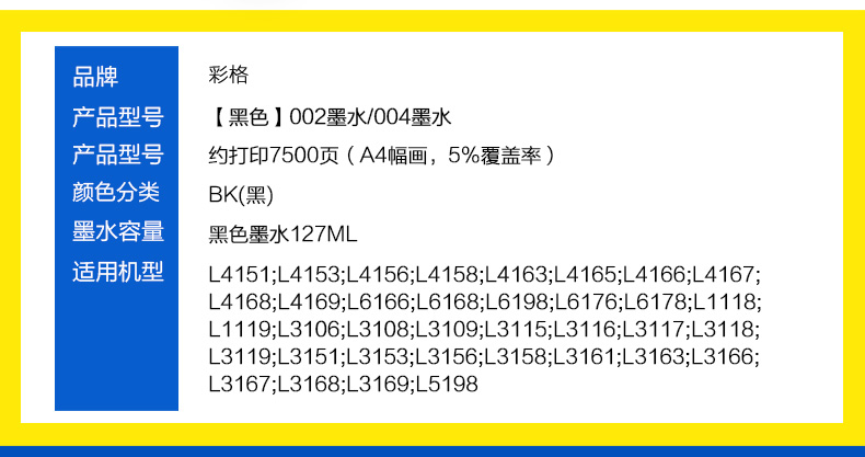 - 商品名称:彩格适用爱普生002黑色墨水 004打印机墨水L4158 L4168 L6168 L6178 L6198 L4166 L3118 L3119 L3153 L3158