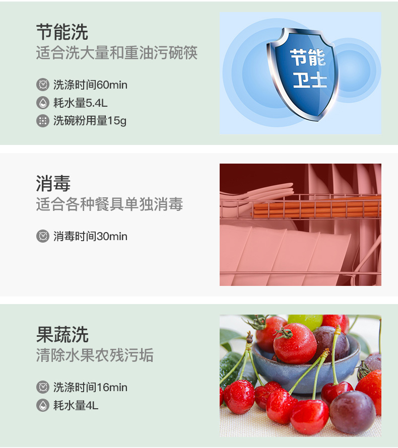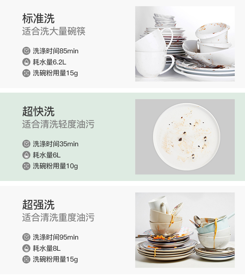 洗涤程序:标准、超快、超强、节能、消毒、果蔬