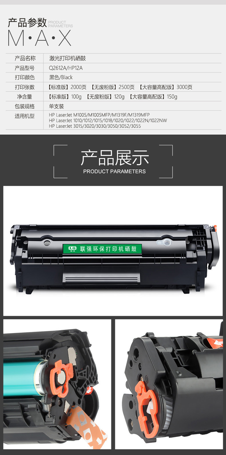 - 商品名称:联强Q2612A硒鼓 适用惠普HP1020/1010/M1005/1018/1022/3055佳能303/FX9/LBP2900
