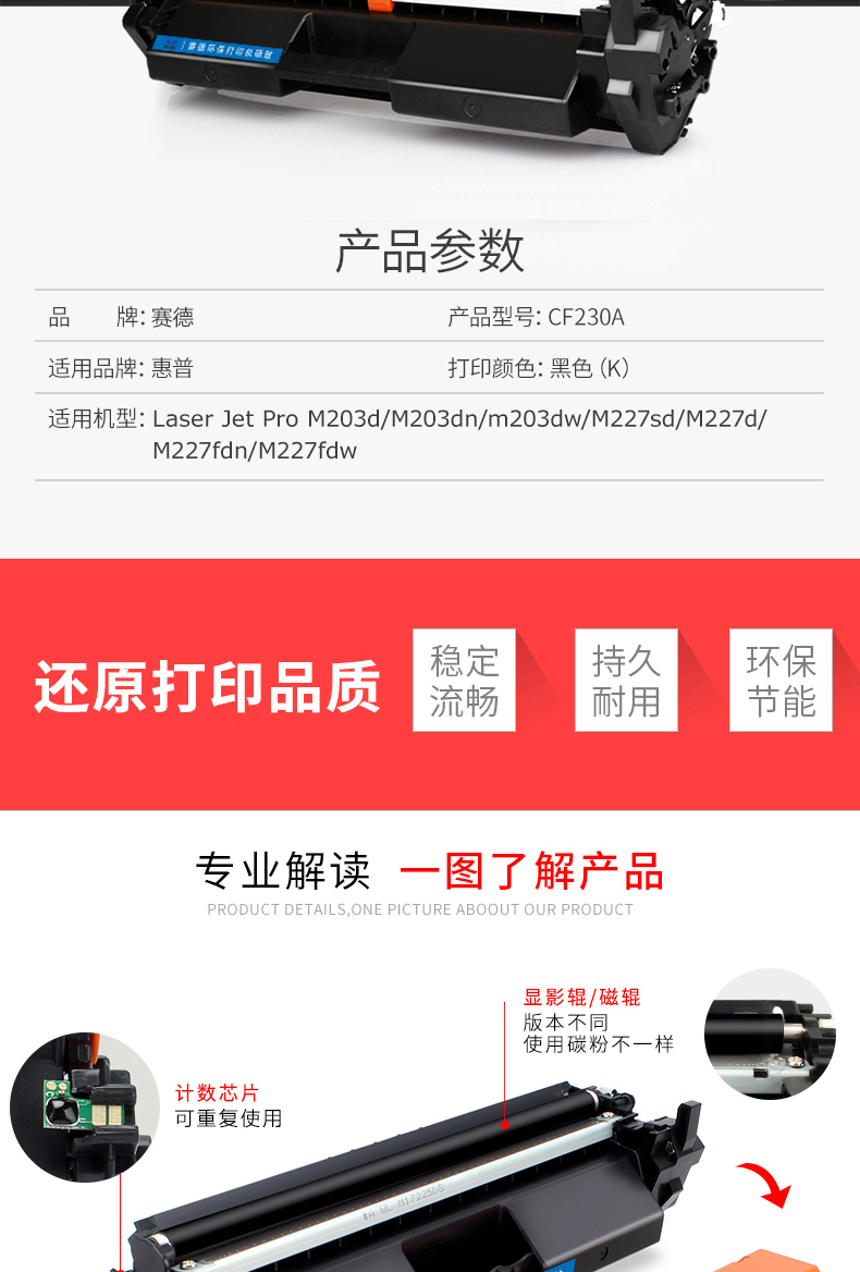 - 商品名称:赛德CF230粉盒(带芯片) 适用于惠普HPM203d/M203dn/M203dw/MFPm227SDN/M227d