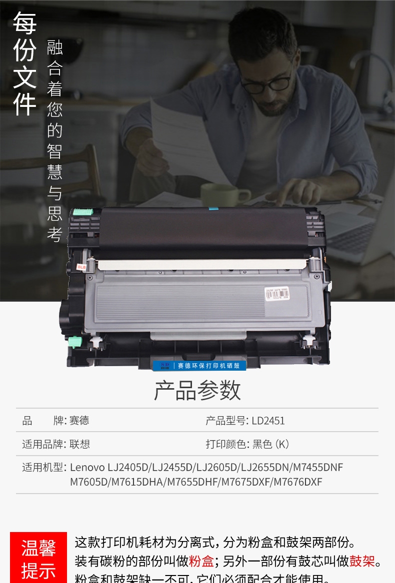 - 商品名称:赛德LD2451硒鼓 适用联想LJ2605D/LJ2655DN/M7605D/M7615DNA/M7455DNF/M7655DHF