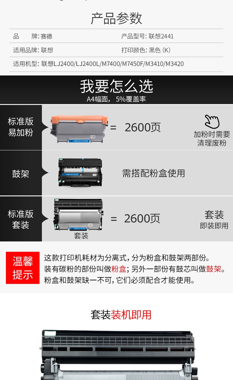 - 商品名称:赛德LT2441粉盒 适用联想LJ2400/LJ2600D/LJ2650DN/M3410/M3420/M7600D/M7650DNF