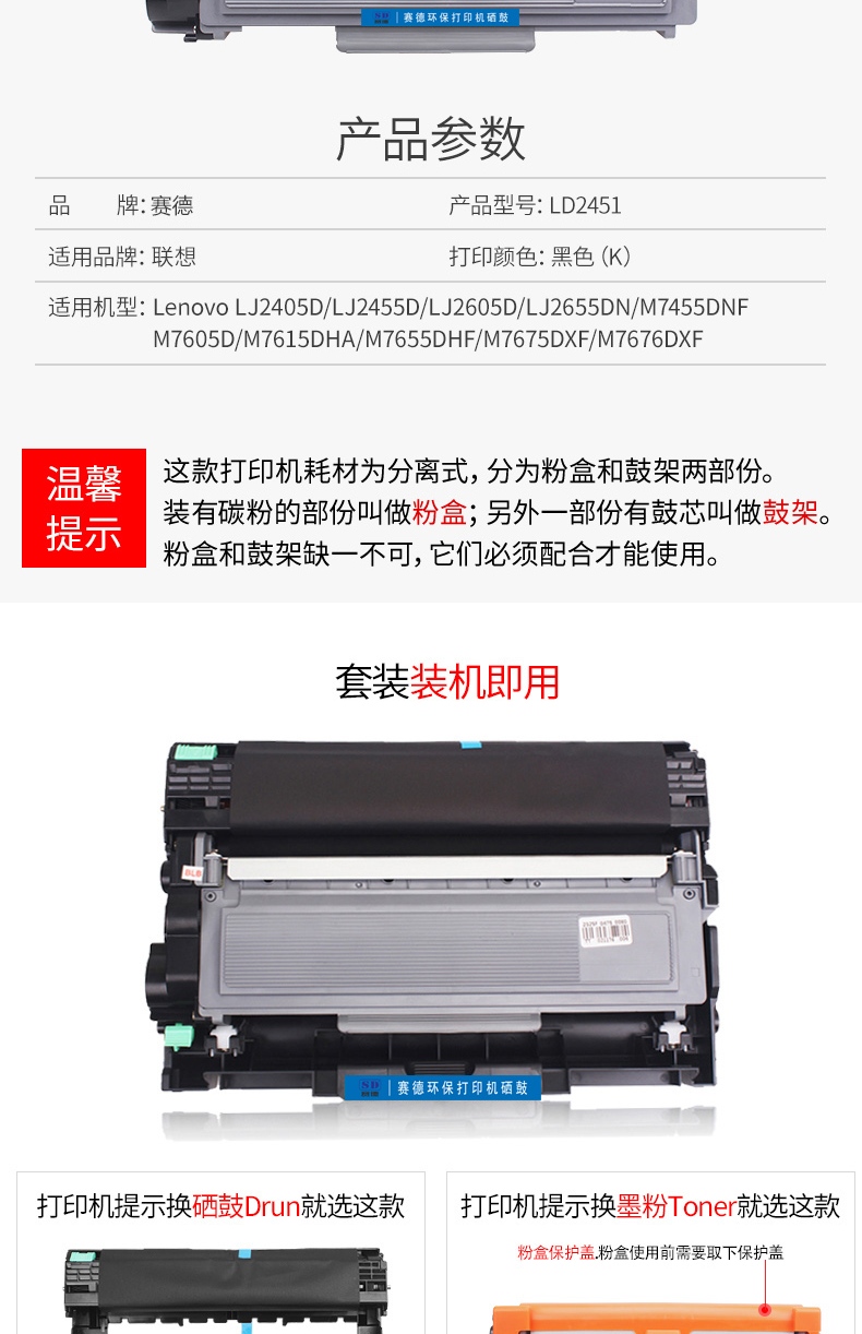 - 适用机型:联想LJ2605D/LJ2655DN/M7605D/M7615DNA/M7455DNF/M7655DHF