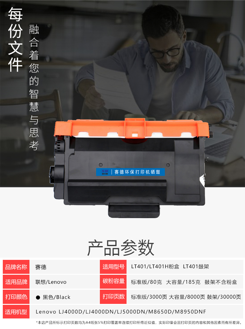 - 商品名称:赛德LT401墨粉盒适用联想 LJ4000D/LJ5000DN/M8650DNL/LJ4000DN/M8650D/M8950DNF