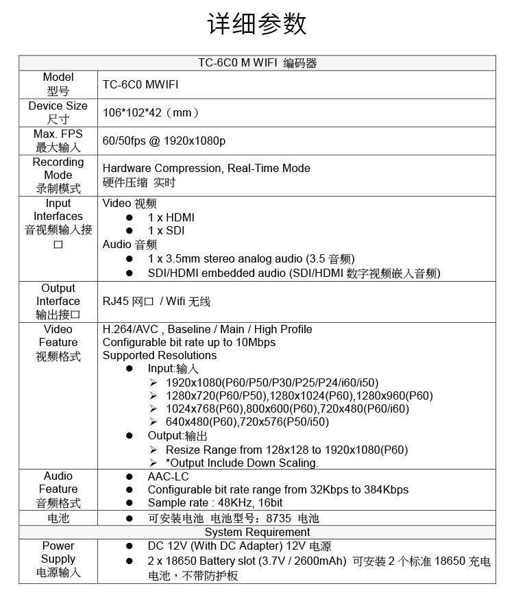 - 商品名称:天创恒达TC-6C0wifi直播编码器HDMI SDI网络高清视频RTMP推流器 低延迟直播机