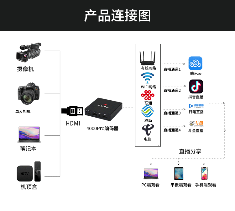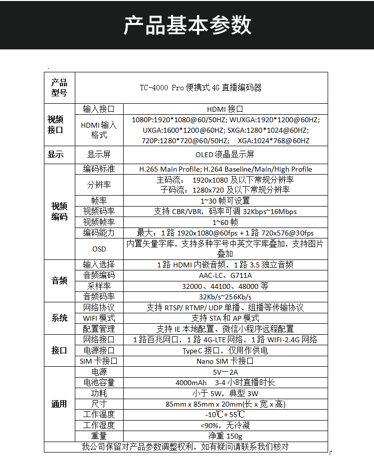 - 商品名称:天创恒达 TC4000直播编码器 hdmi高清 4G网络视频推流器 户外RTMP婚庆教学会议直播机 定制机型
