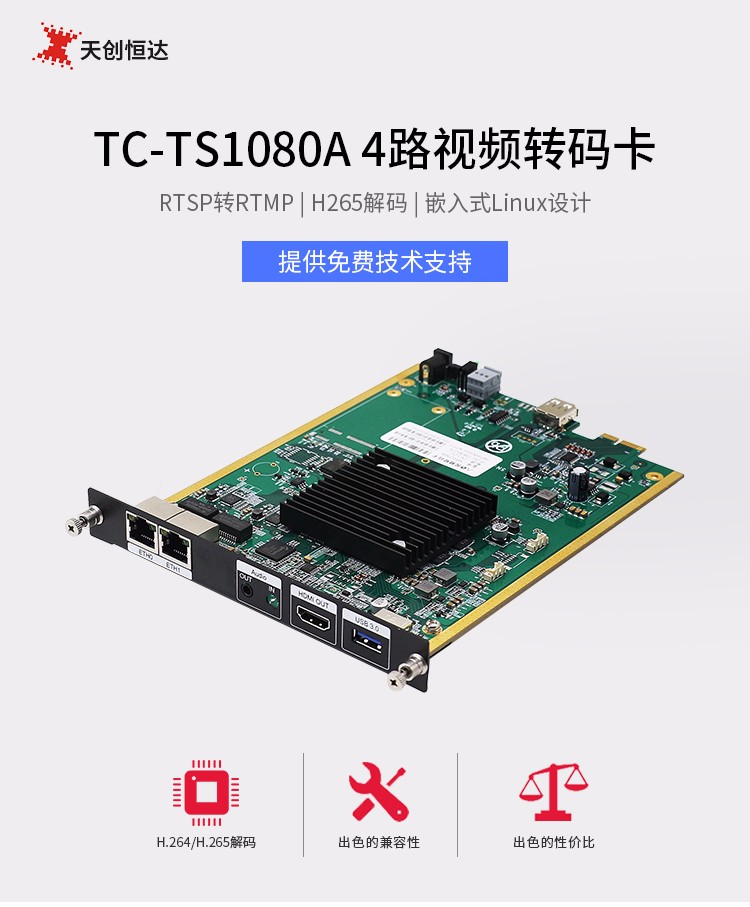 - 商品名称:天创恒达TS1108转码卡 扩展卡 高清视频监控解码器 RTSP转RTMP