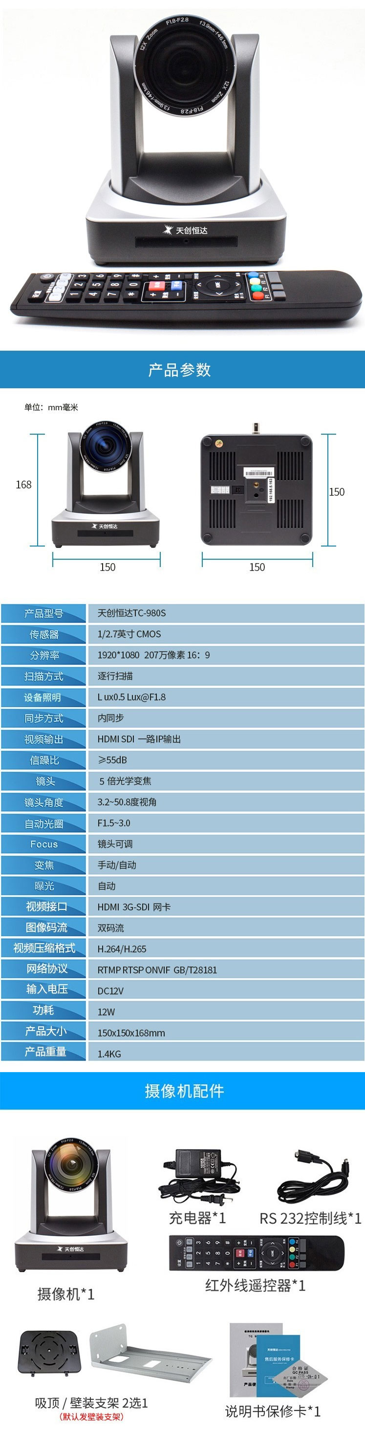 - 商品名称:天创恒达980S wifi直播摄像头 USB高清 云台 广角5倍变焦 网店主播 珠宝直播 高清录播