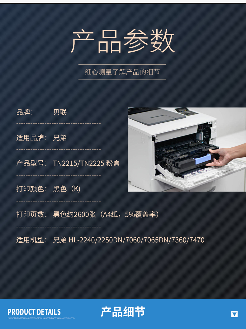 - 商品名称:贝联TN2215墨粉盒 TN-2225 适用兄弟 HL-2240/2250DN/7060/7065DN/7360/7470