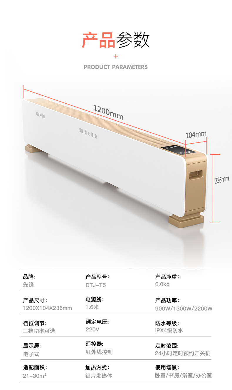 - 商品名称:先锋(Singfun)DTJ-T5踢脚线取暖器电暖器电暖气遥控防水移动地暖家用居浴两用 白金色2200W智能电暖气