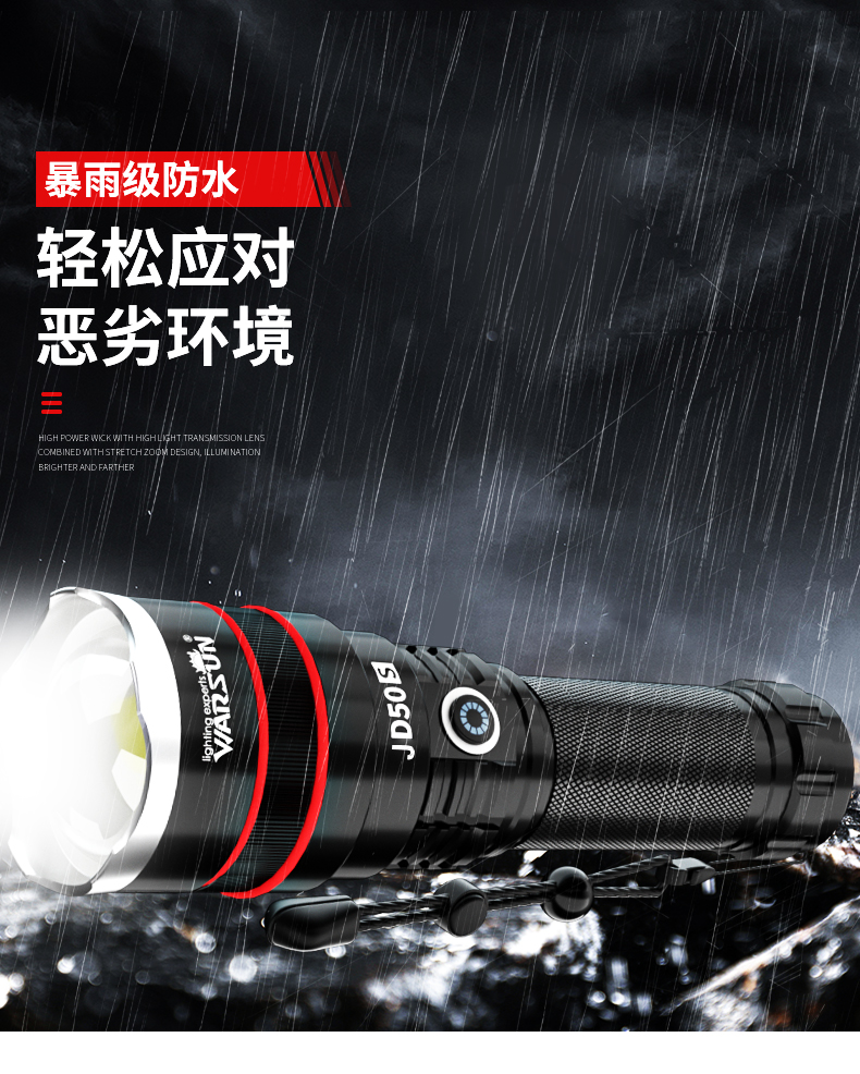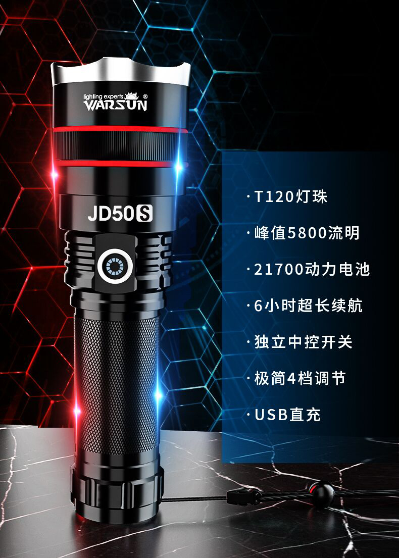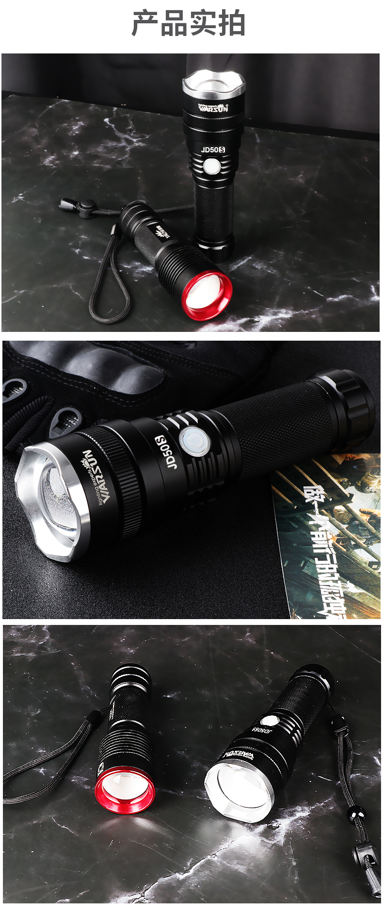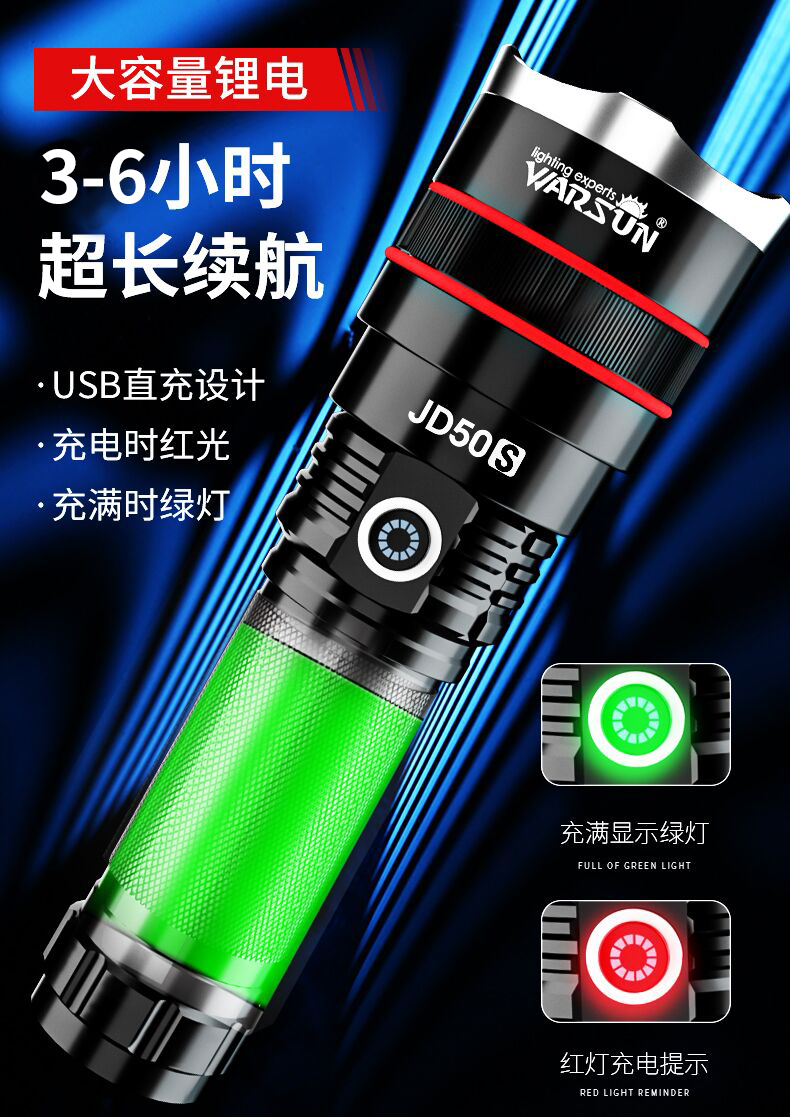 - 商品名称:Warsun沃尔森 JD50S手电筒多功能变焦强光手电超亮远射led可充电非氙气防水探照灯5000小