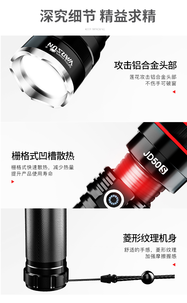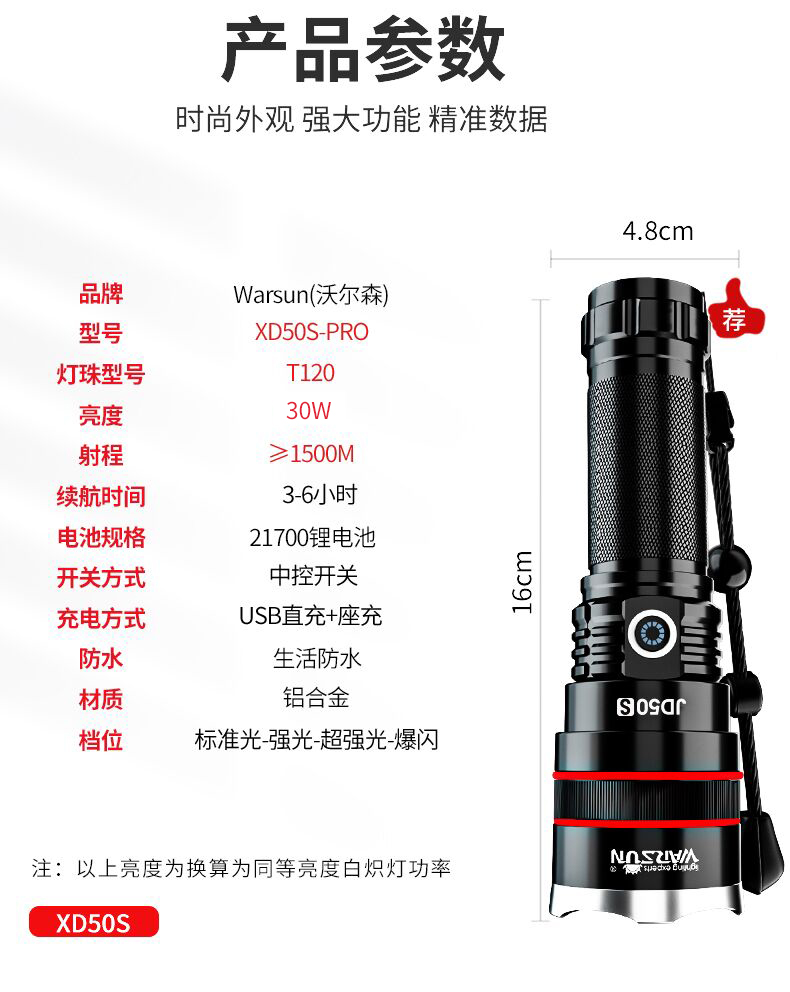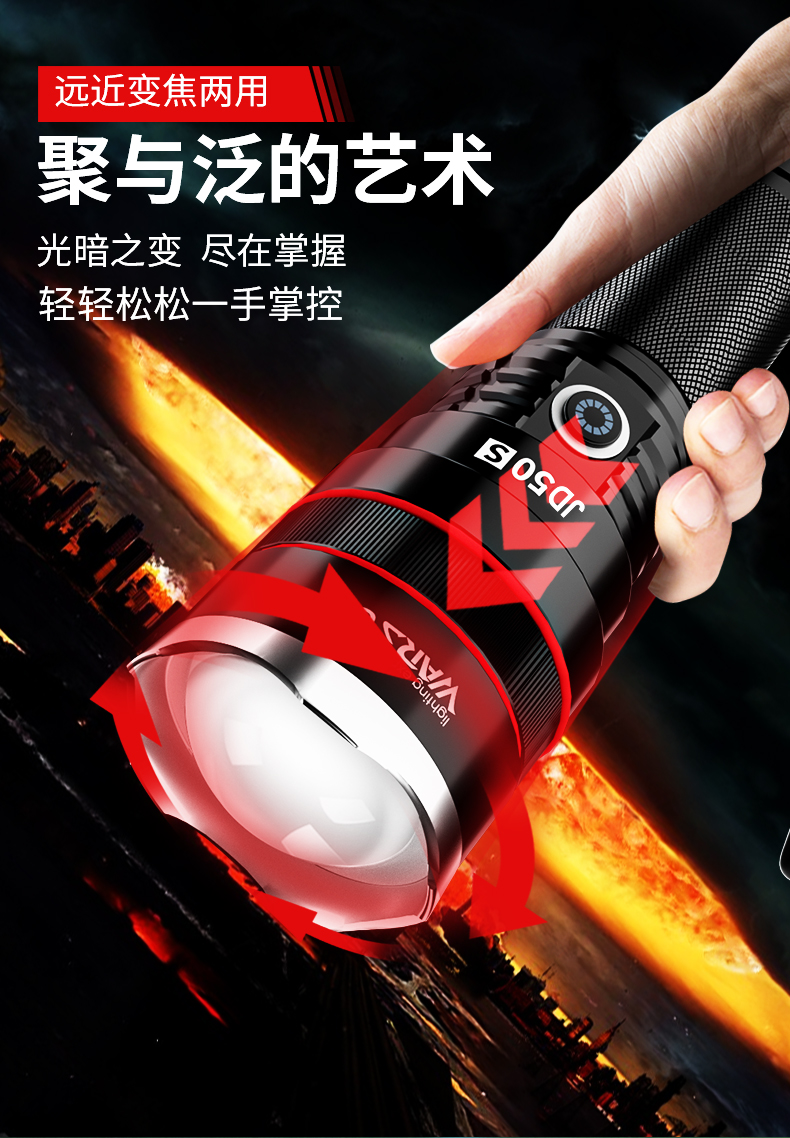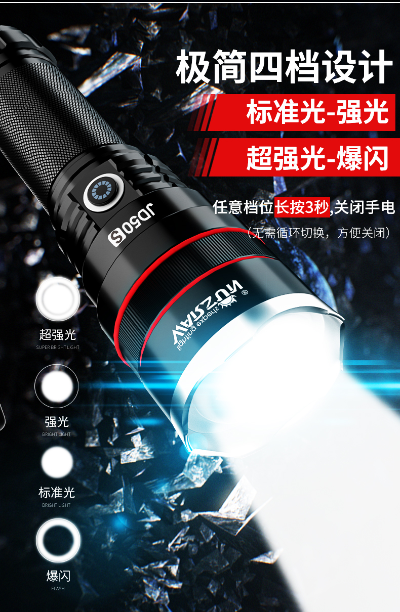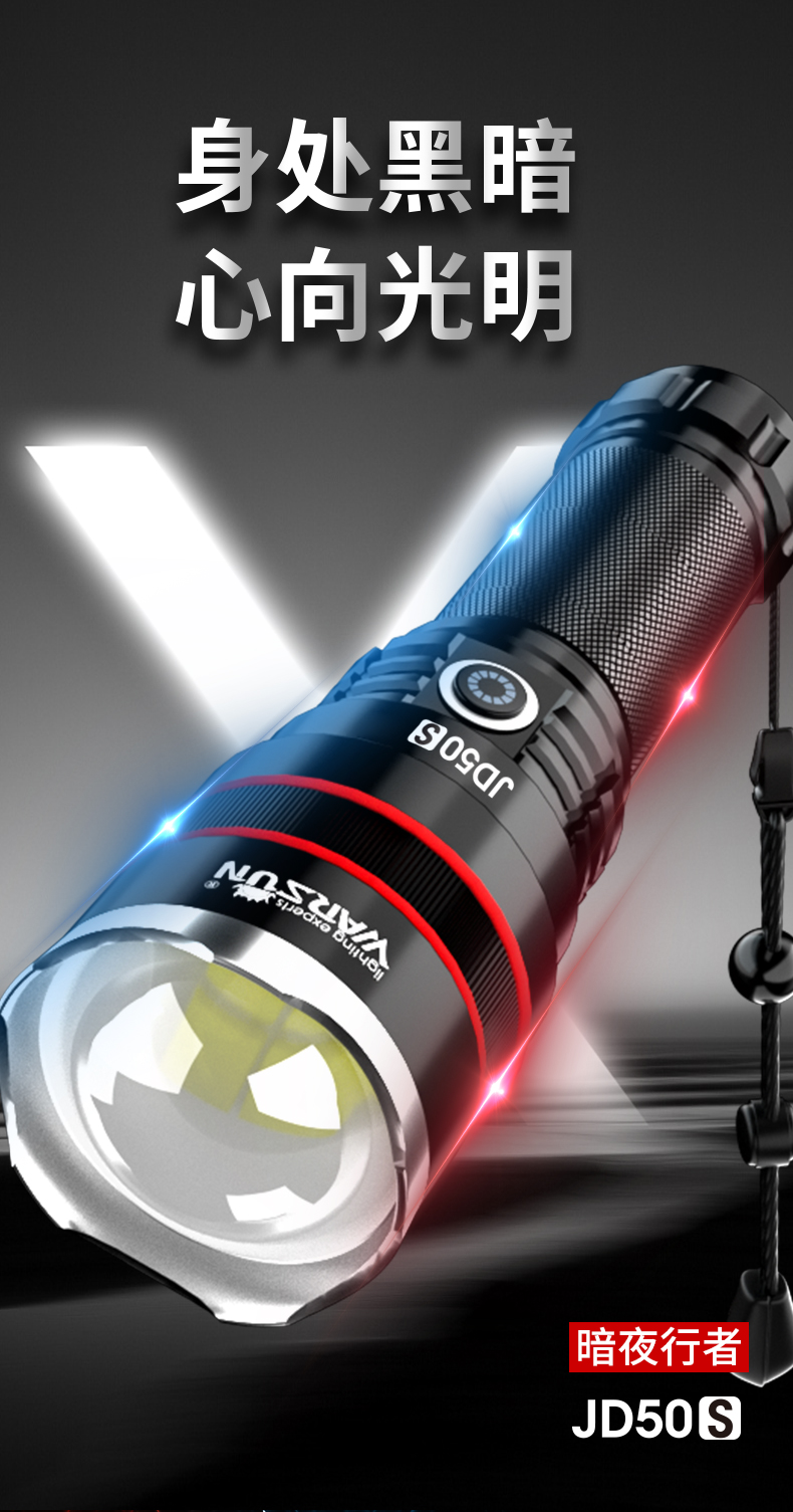 - 商品名称:Warsun沃尔森 JD50S手电筒多功能变焦强光手电超亮远射led可充电非氙气防水探照灯5000小