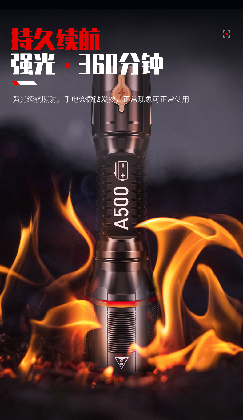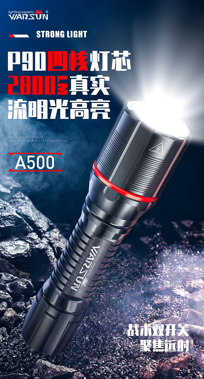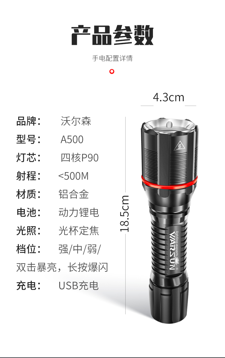 - 商品名称:Warsun沃尔森 A500手电筒多功能定焦强光手电超亮远射led可充电非氙气防水探照灯应急灯