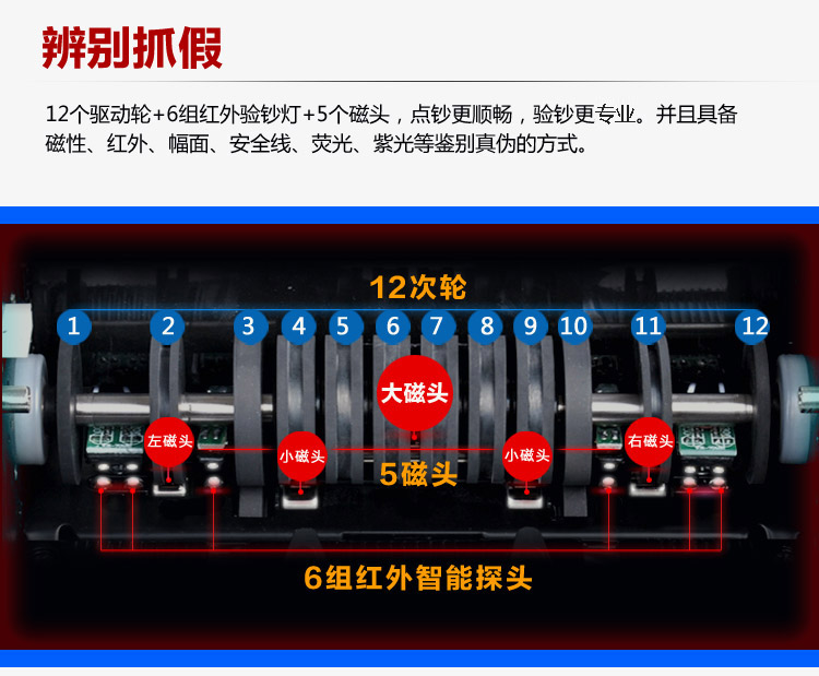 - 鉴伪方式:磁性检测;安全线检测;荧光检测;紫光检测;红外鉴伪;幅面鉴伪