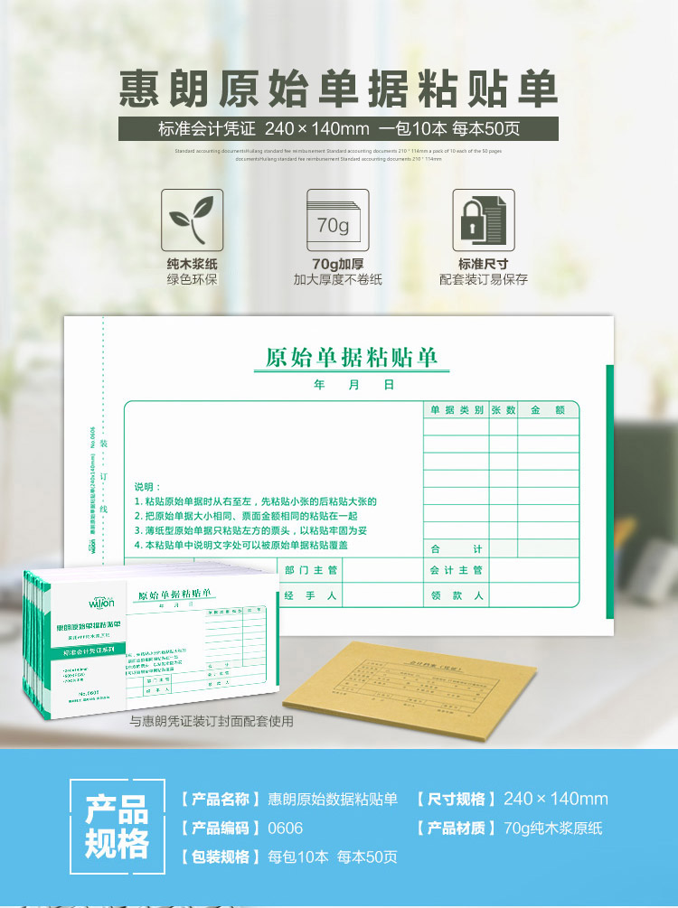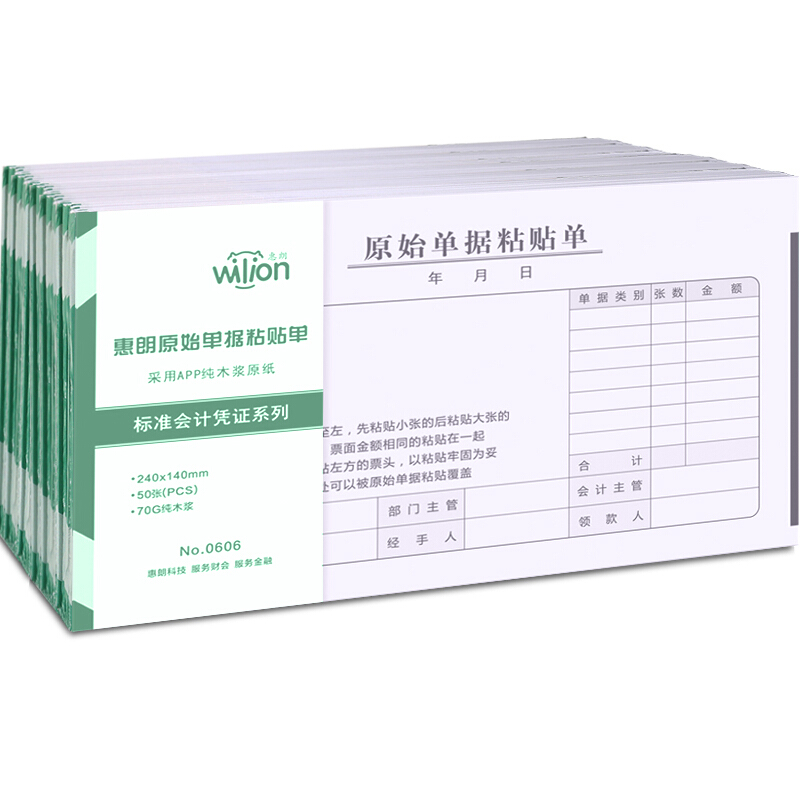 - 商品名称:惠朗(huilang)0606发票版原始单据粘贴单240*140mm财务单据10本/包 50页/本