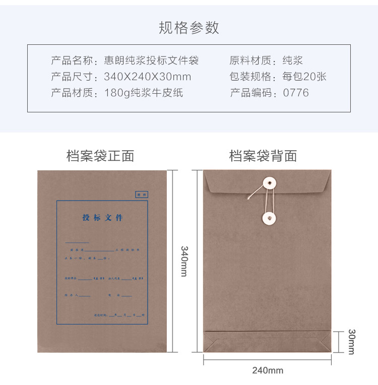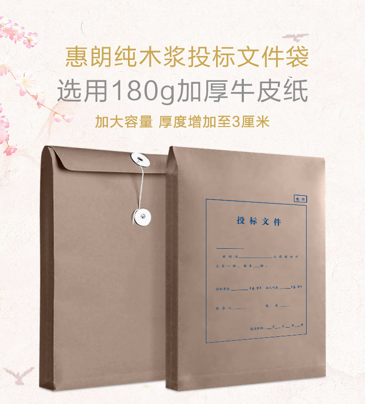 - 商品名称:惠朗(huilang)投标袋A4标书袋纯木浆档案袋文件袋资料袋 20只进口GP纸0776