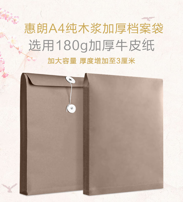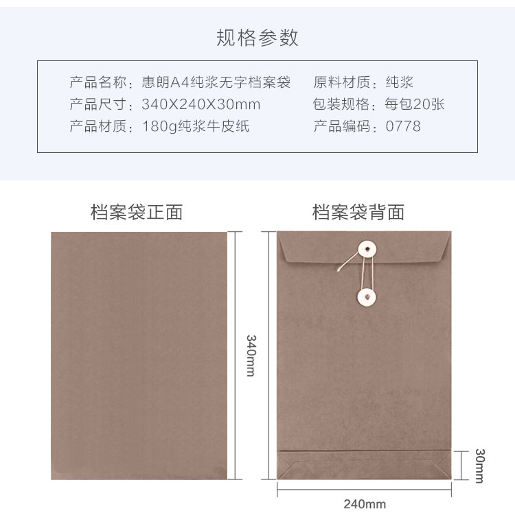 - 商品名称:惠朗(huilang)空白A4档案袋纯木浆加厚文件袋投标袋资料袋 20只进口GP纸0778