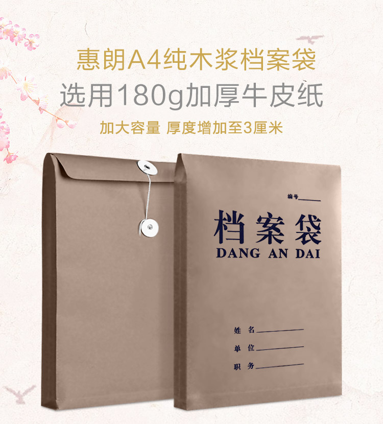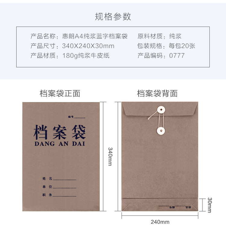 - 商品名称:惠朗(huilang)蓝字A4档案袋加厚文件袋资料袋投标袋 20只蓝色字体进口GP纸0777
