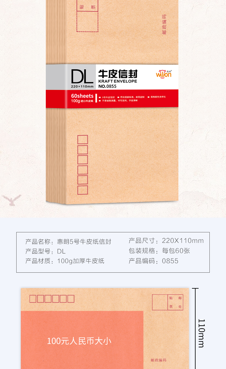 - 商品名称:惠朗(huilang)60张5号牛皮纸信封 加厚邮局标准信封工资袋220*110mm0855
