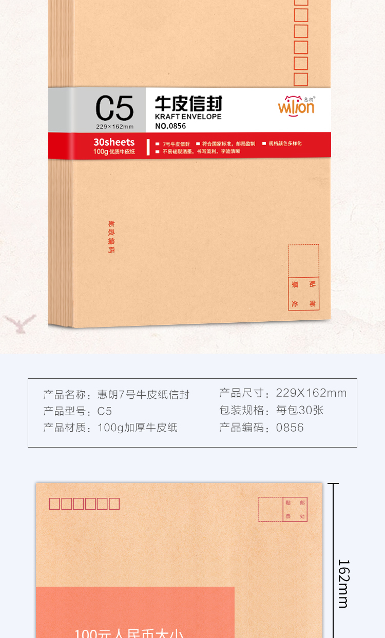 - 商品名称:惠朗(huilang)30张7号牛皮纸信封 加厚邮局标准信封229*162mm0856