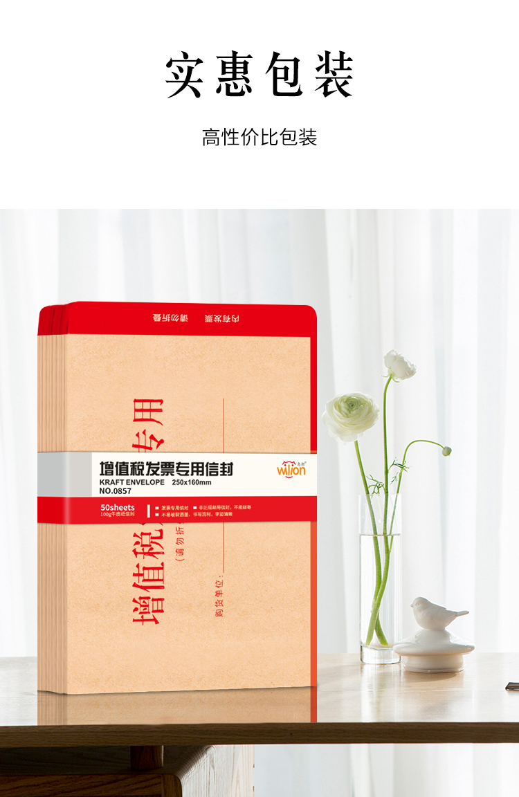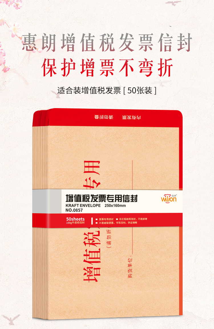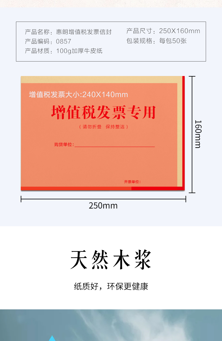 - 商品名称:惠朗(huilang)50张加厚增值税发票信封 100g牛皮纸财务票据袋0857