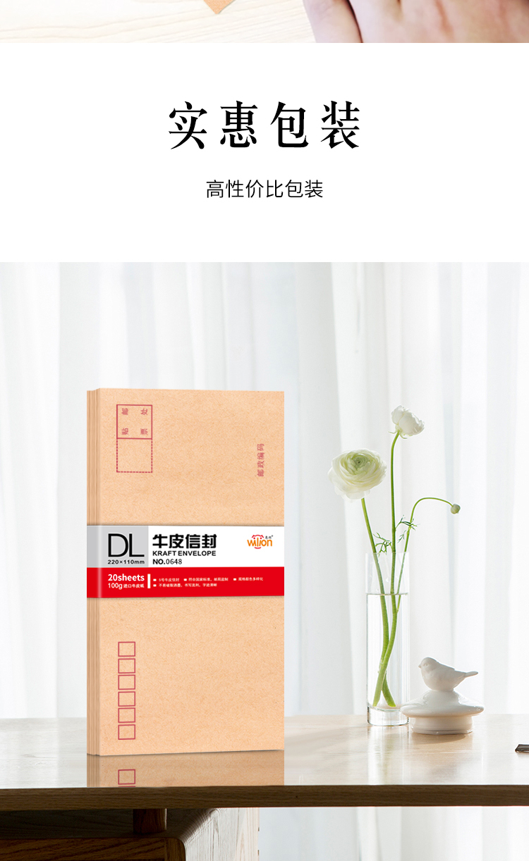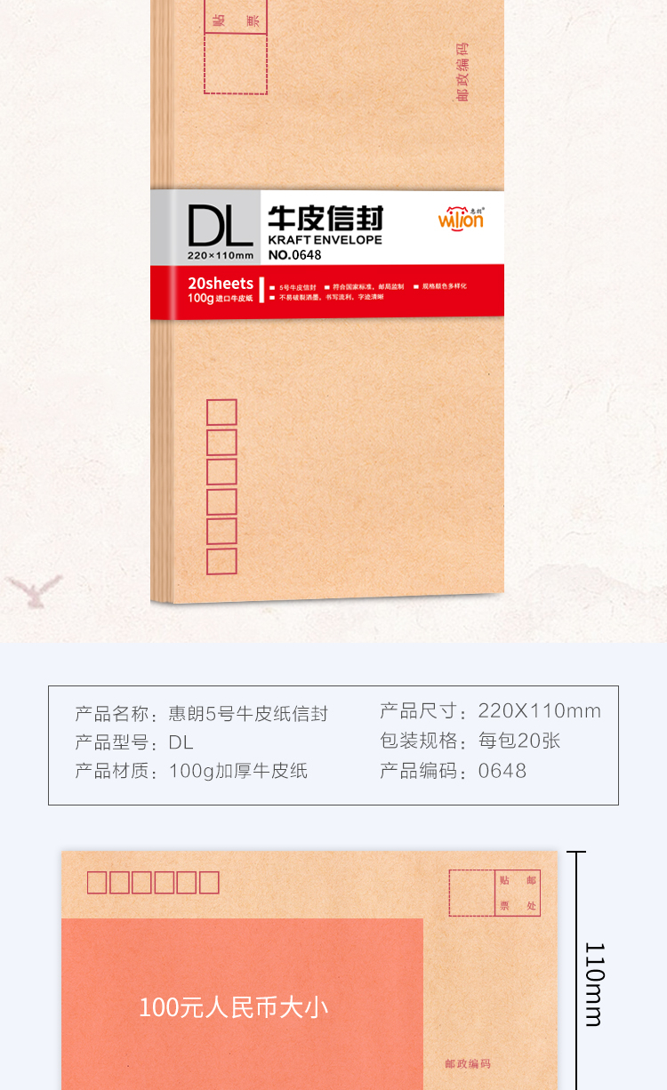 商品名称:惠朗(huilang)20张5号牛皮纸信封 加厚邮局标准信封工资袋220*110mm0648