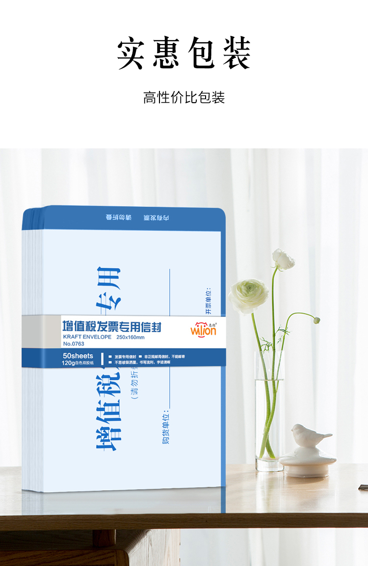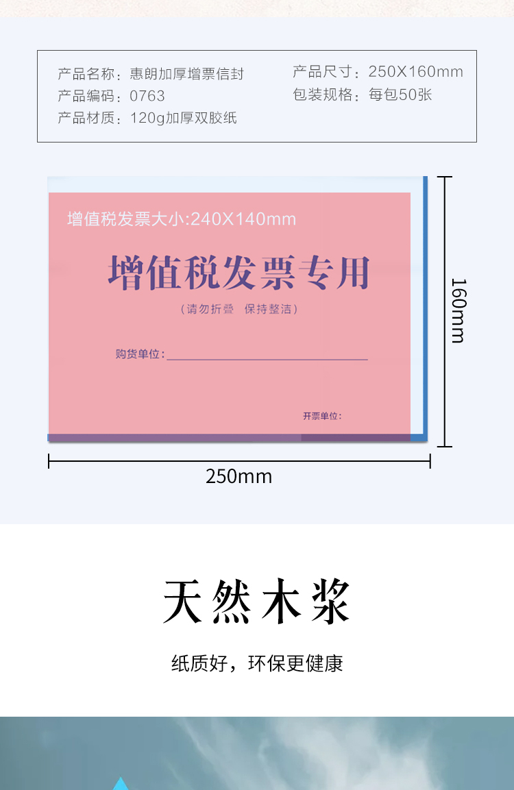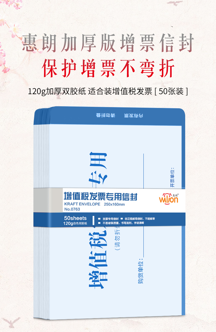 - 商品名称:惠朗(huilang)50张加厚增值税发票信封 120g白色财务票据袋0763