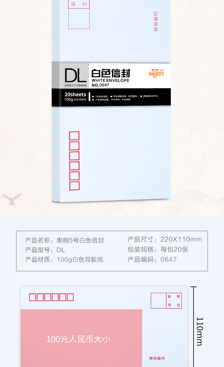 - 商品名称:惠朗(huilang)0647-5号白色信封 邮局标准信封20张(单包)