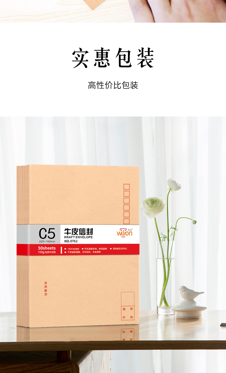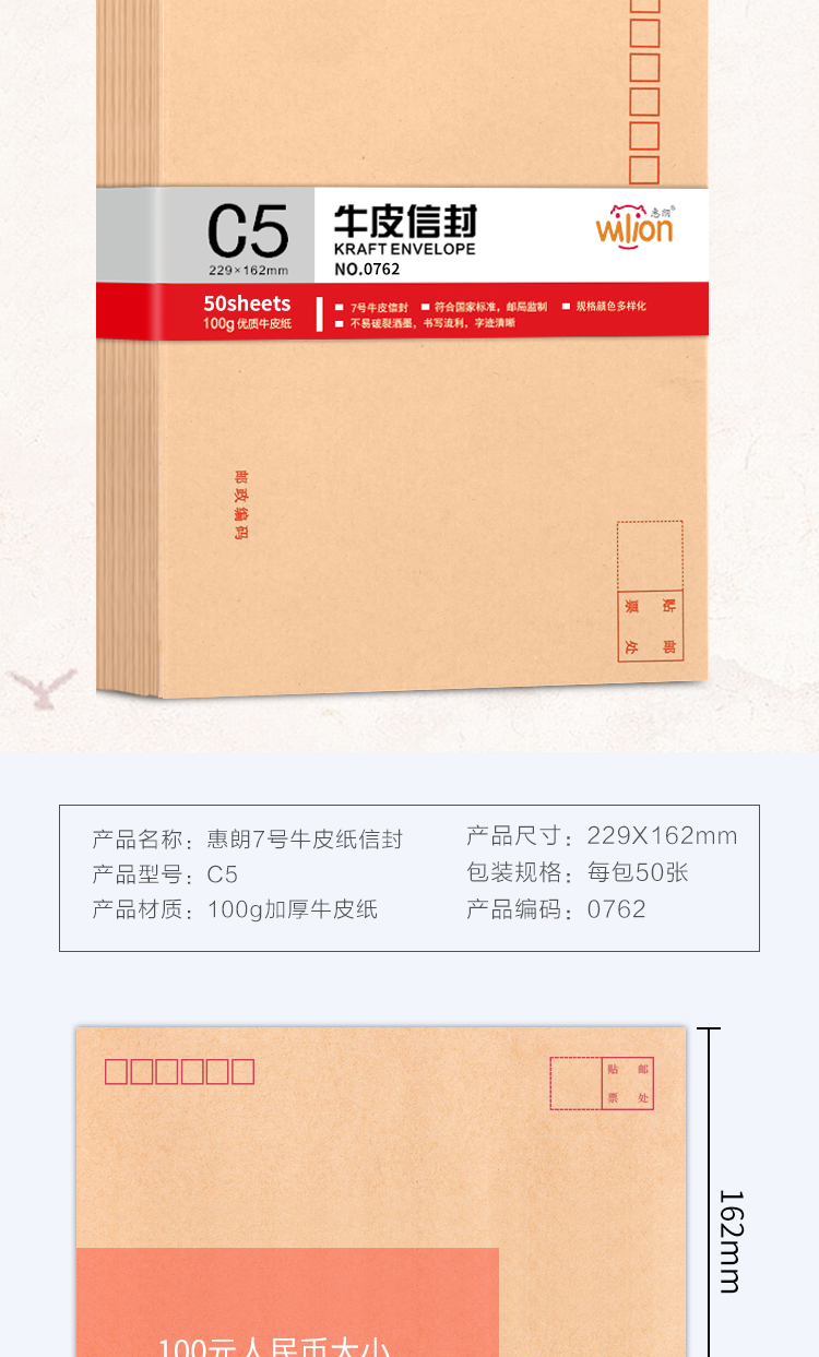 - 商品名称:惠朗(huilang)50张7号牛皮纸信封 加厚邮局标准信封229*162mm0762