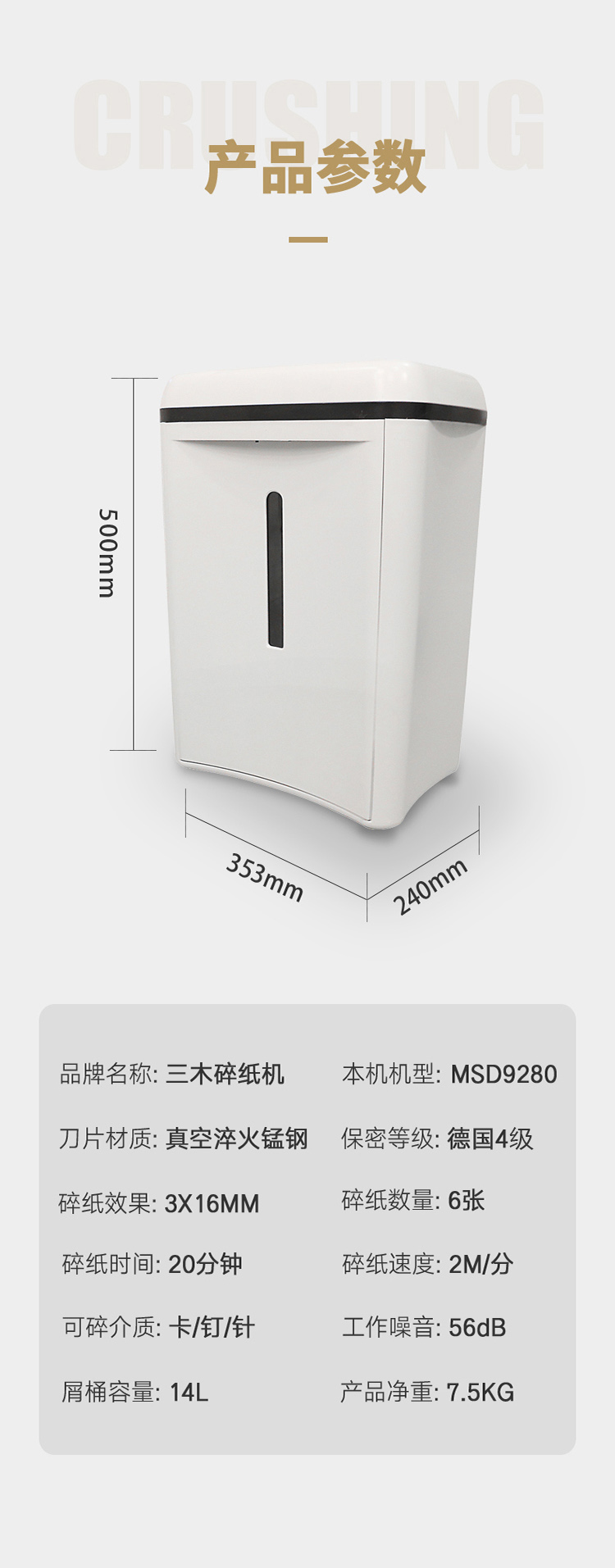 - 商品名称:三木(SUNWOOD)MSD9280锰钢侠系列碎纸机/文件粉碎机 四级保密