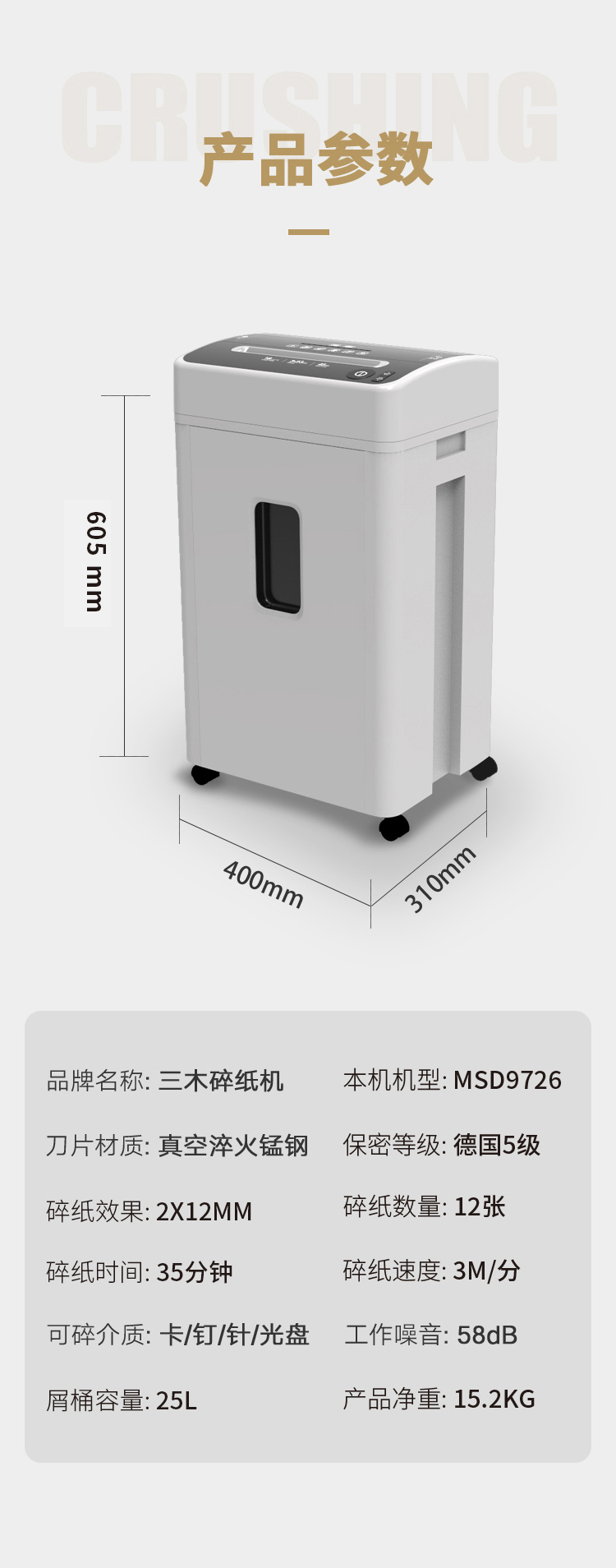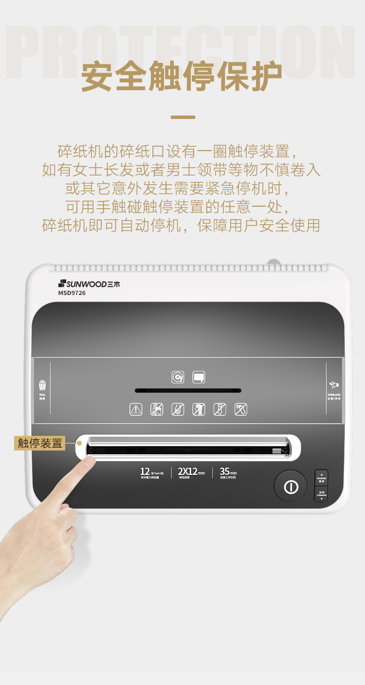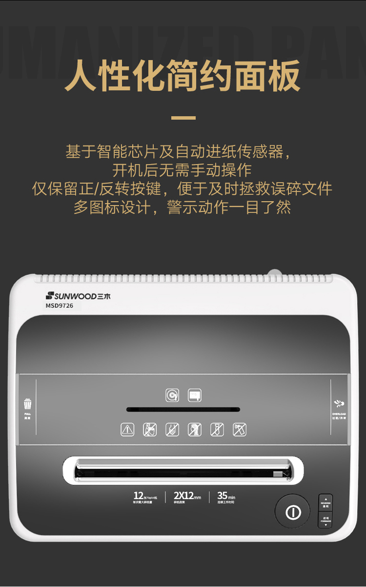 - 商品名称:三木(SUNWOOD) MSD9726 锰钢侠系列碎纸机/文件粉碎器/双入口/安全触停 五级保密