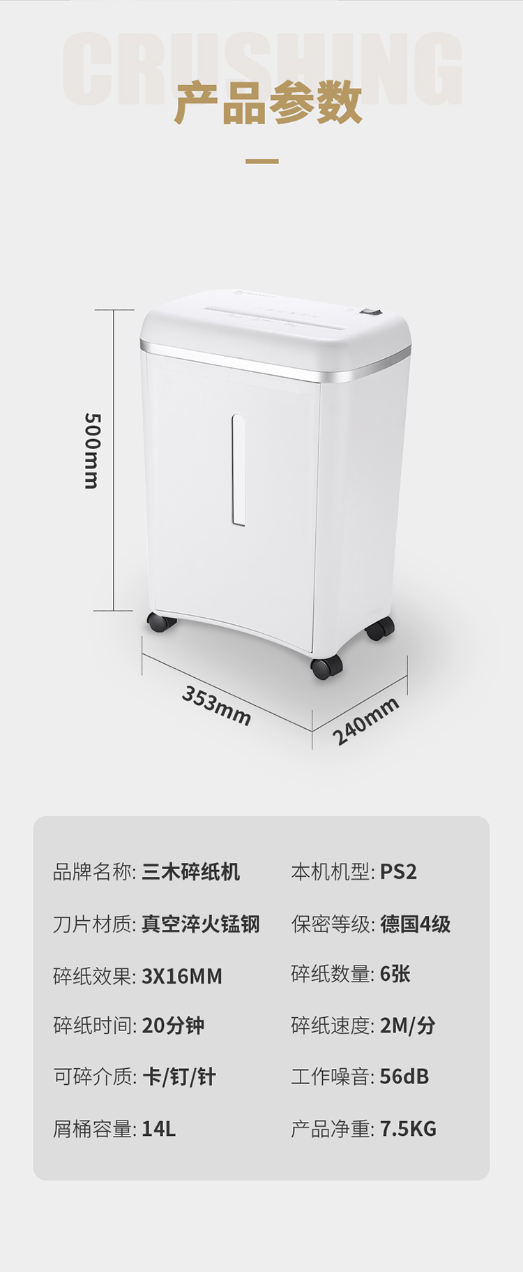 - 商品名称:三木(SUNWOOD)PS2效率王碎纸机 德国四级保密 20分钟连续碎纸