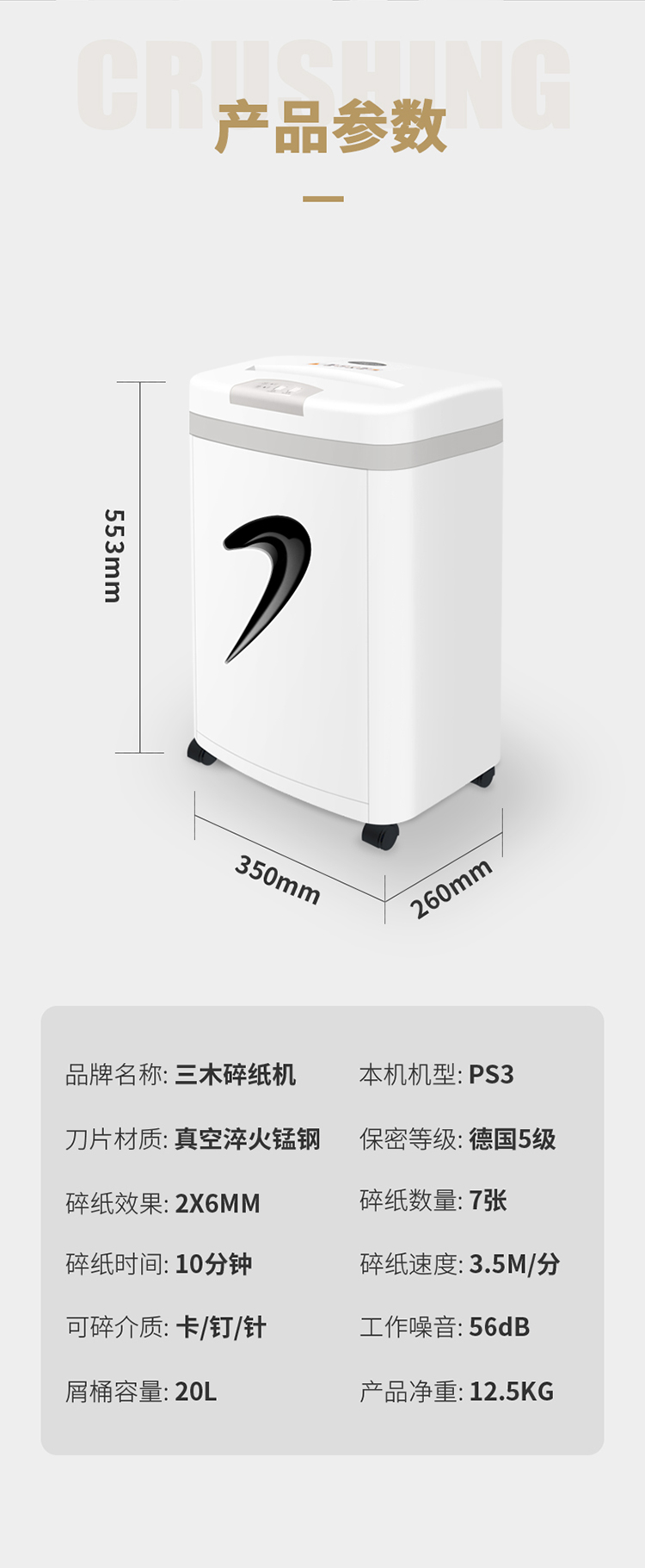 - 商品名称:三木(SUNWOOD)PS3效率王碎纸机 德国五级保密 连续碎纸10分钟 双温控系统