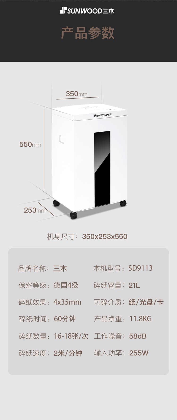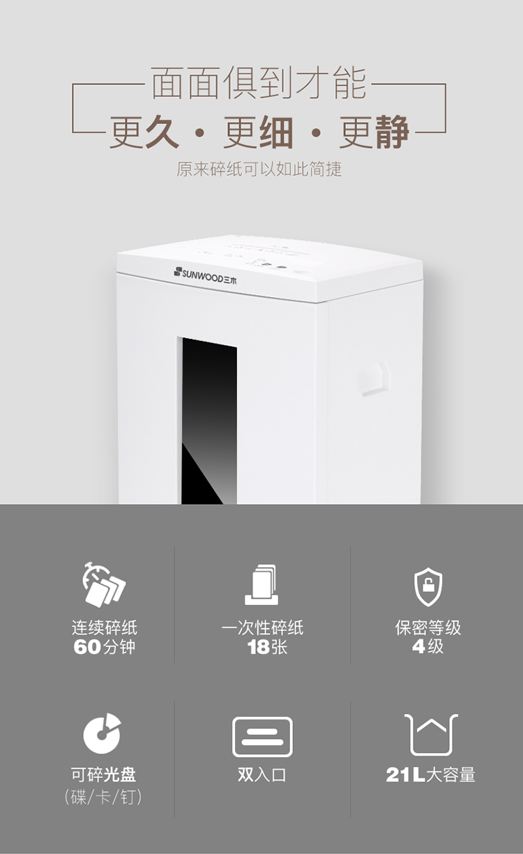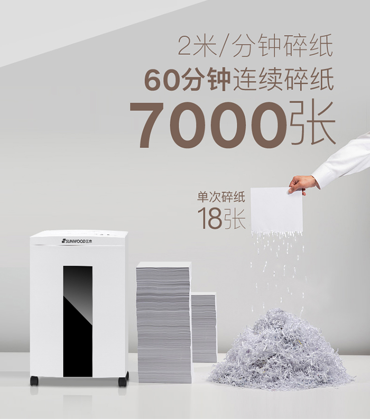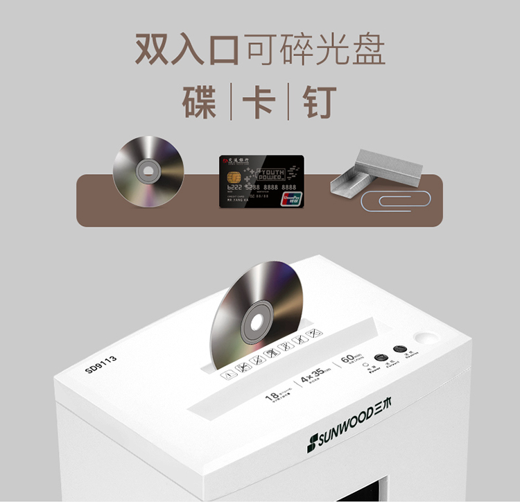 - 商品名称:三木(SUNWOOD)SD9113双入口碎纸机 德国4级保密 单次碎纸18张 连续工作60分钟