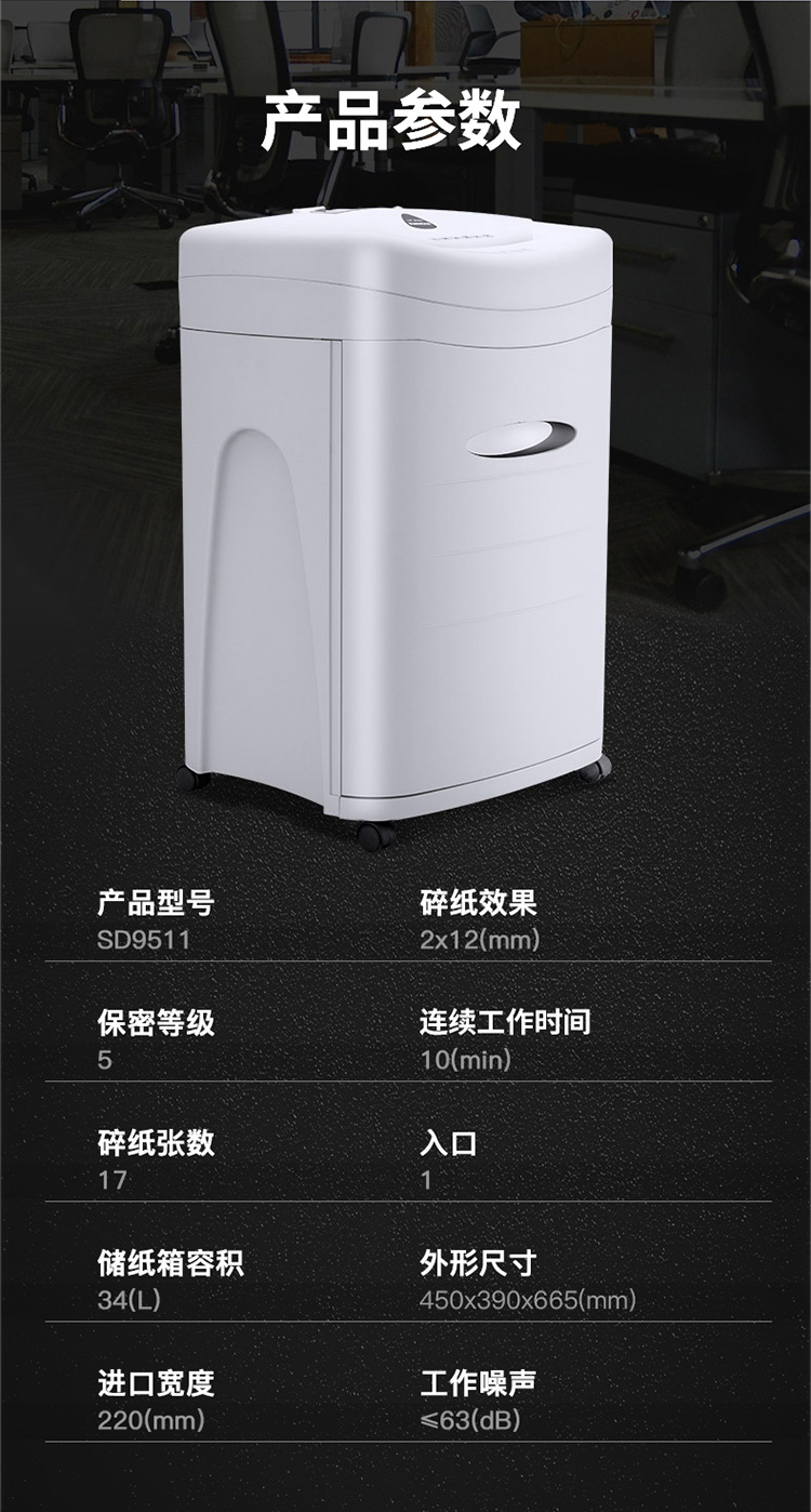 - 商品名称:三木(SUNWOOD)SD9511德国5级保密碎纸机/文件粉碎机34升大容量 可碎钉/卡/光盘