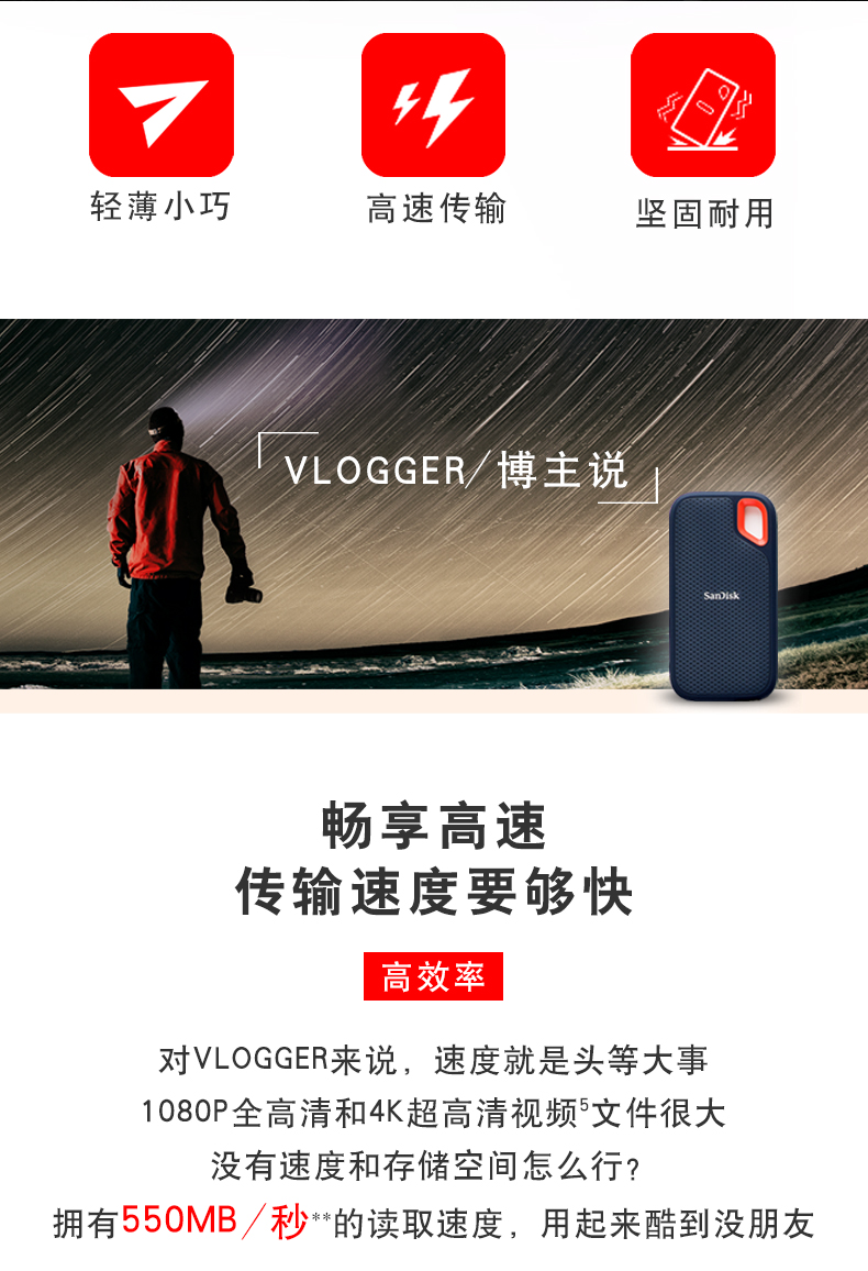- 商品名称:闪迪(SanDisk)2TB Type-c 移动硬盘 固态(PSSD)极速移动版 传输速度550MB/s 轻至40g IP55等级三防保护