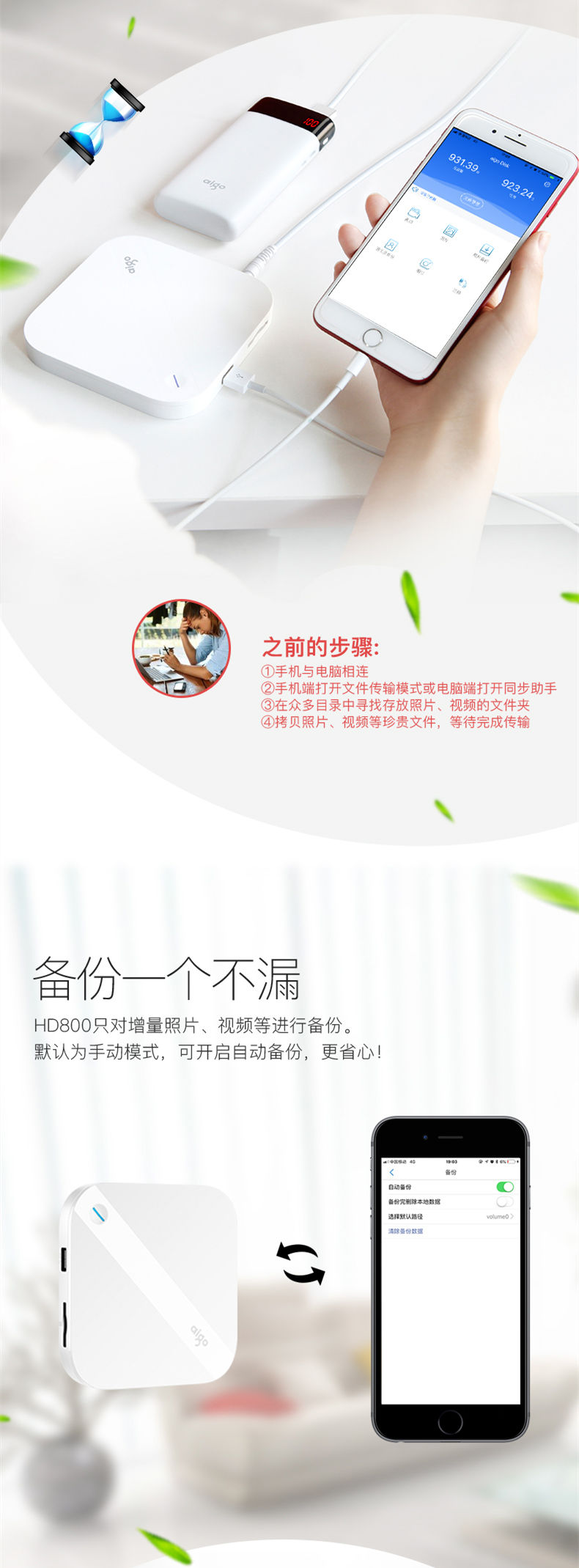 爱国者(aigo)1TB USB3.0 智能移动硬盘 HD800 白色 手机硬盘 支持苹果 安卓 手机平板自动备份 SD卡扩展