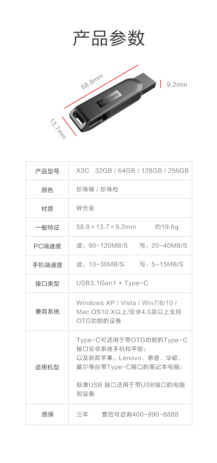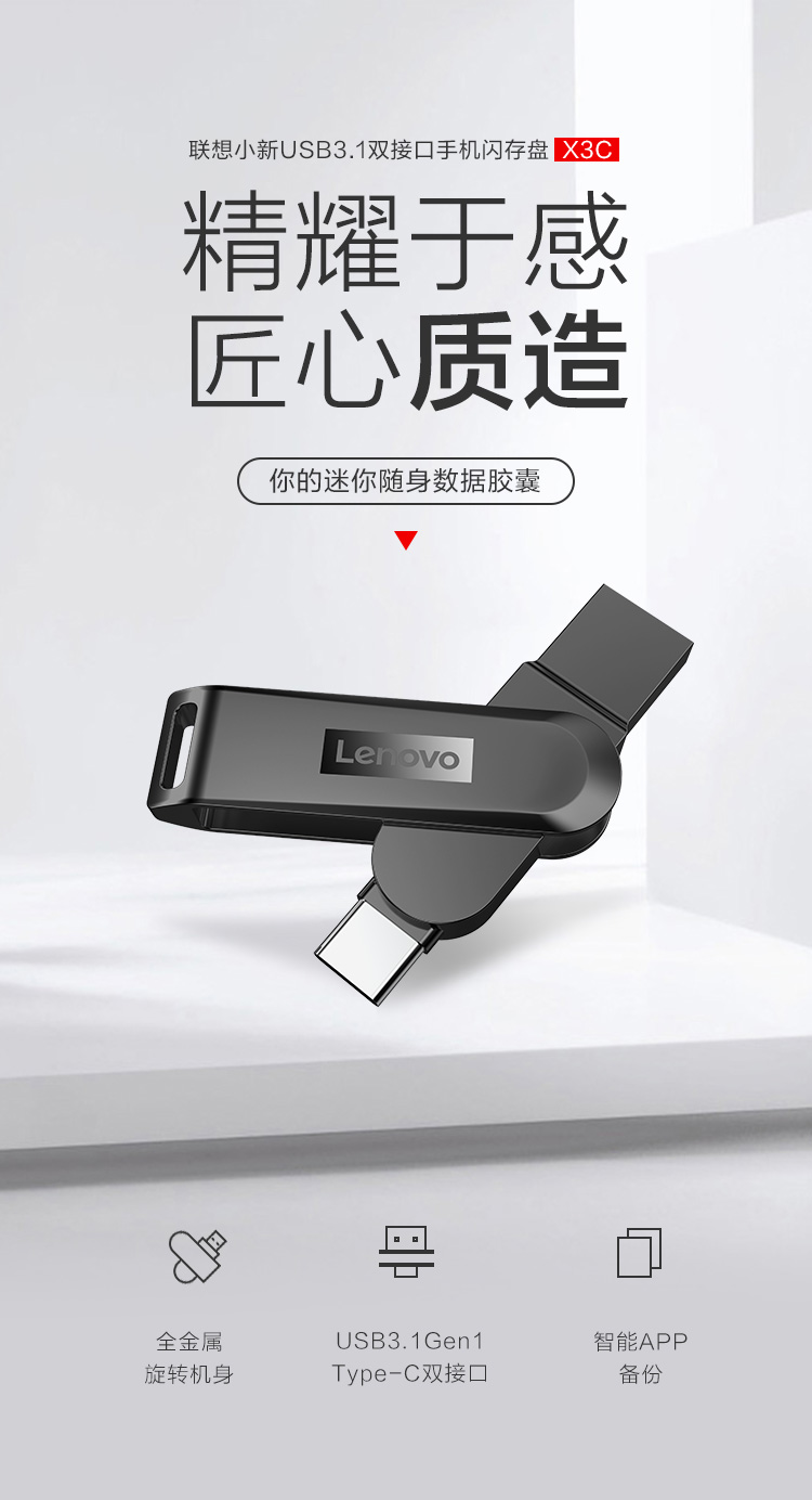 商品名称:联想(Lenovo)256GB Type-C USB3.1 手机U盘 X3C 深空黑 全金属 双接口旋转 高速读写手机电脑两用优盘