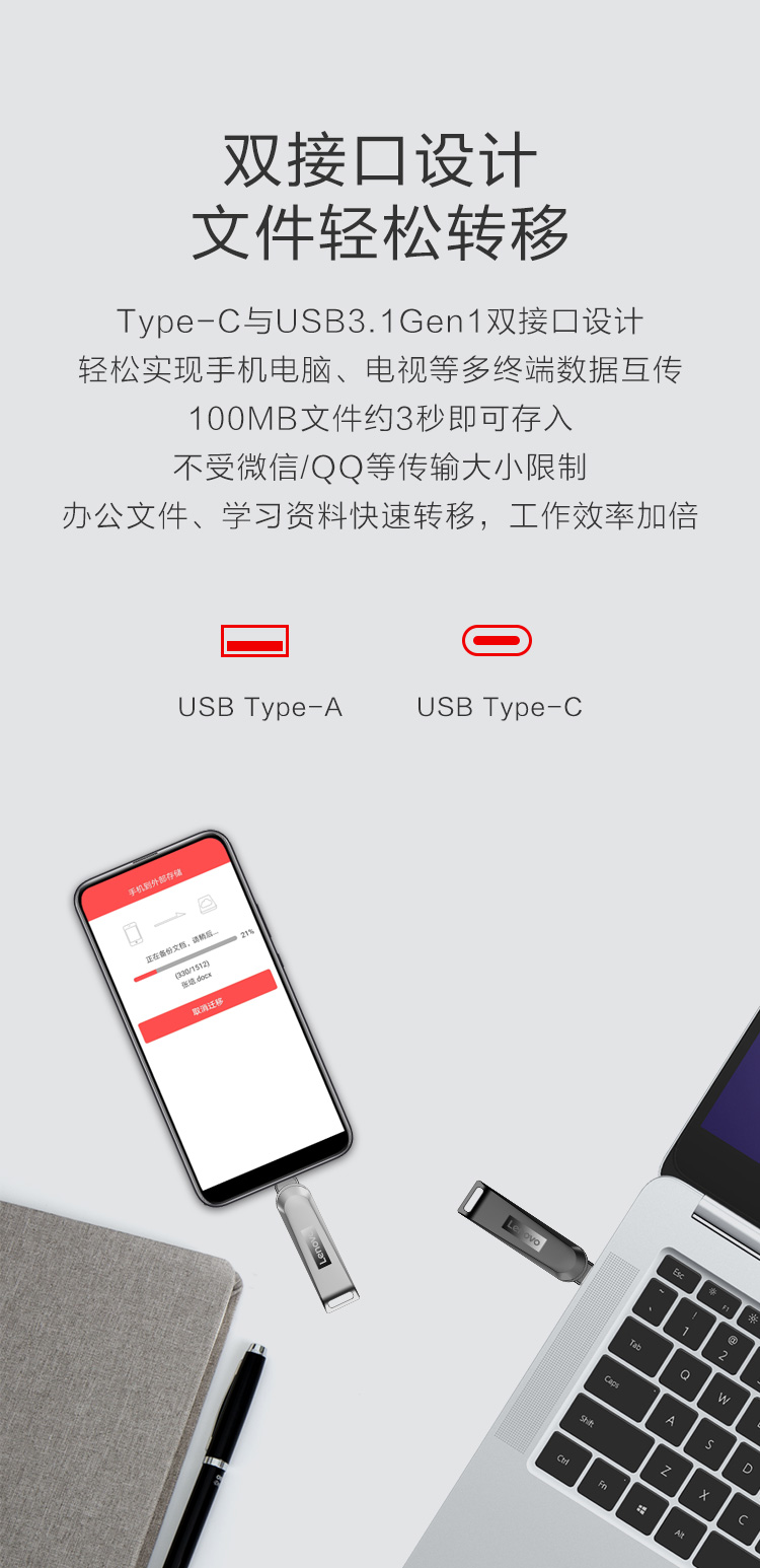 联想(Lenovo)256GB Type-C USB3.1 手机U盘 X3C 深空黑 全金属 双接口旋转 高速读写手机电脑两用优盘