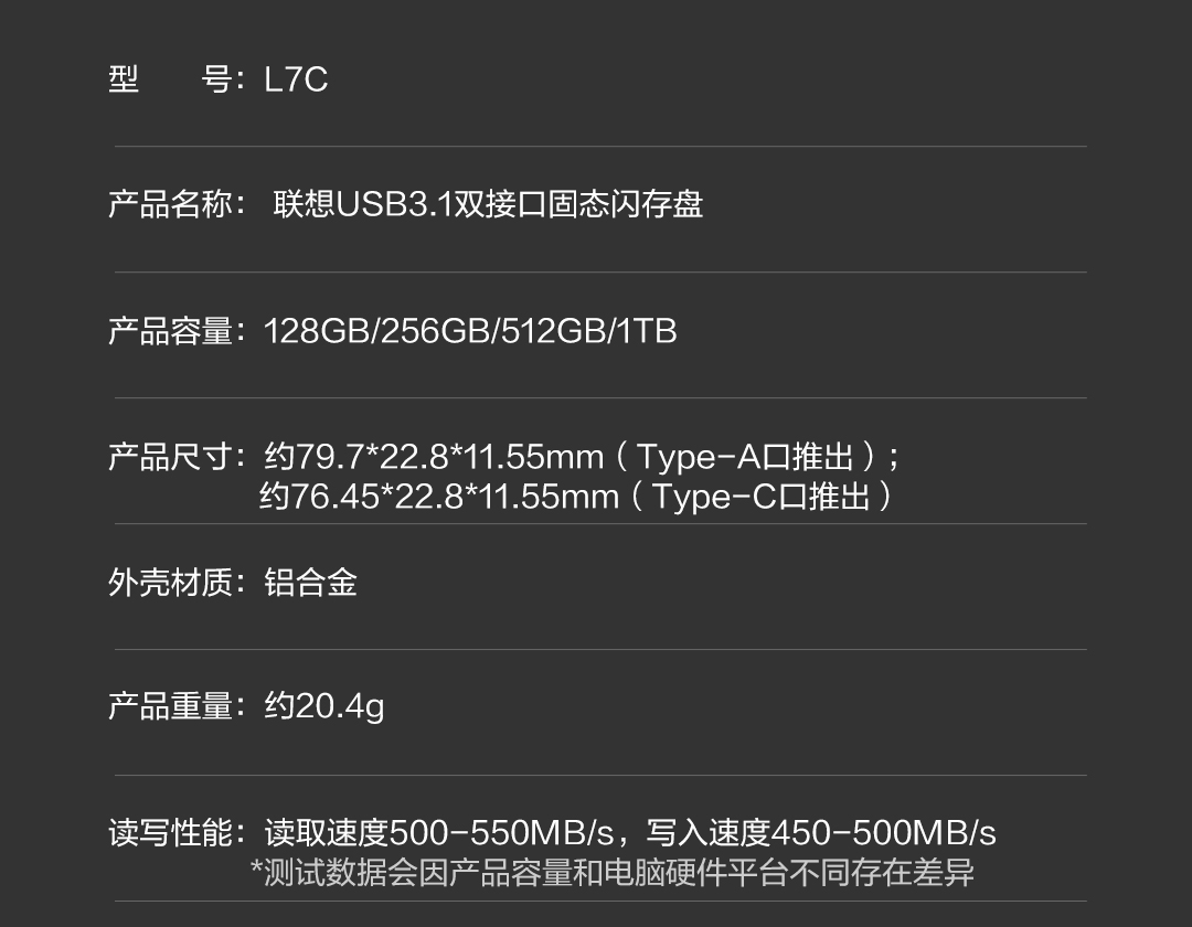 商品名称:联想(Lenovo)L7C 固态U盘 高速传输 USB3.1和Type-C双接口 手机U盘 双接口固态闪存盘(256GB)