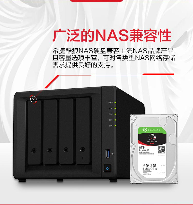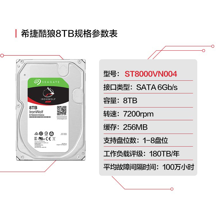 商品名称:希捷(Seagate) NAS硬盘 8TB 256MB 7200转 PMR CMR垂直磁记录 网络存储 SATA 希捷酷狼IronWolf ST8000VN004