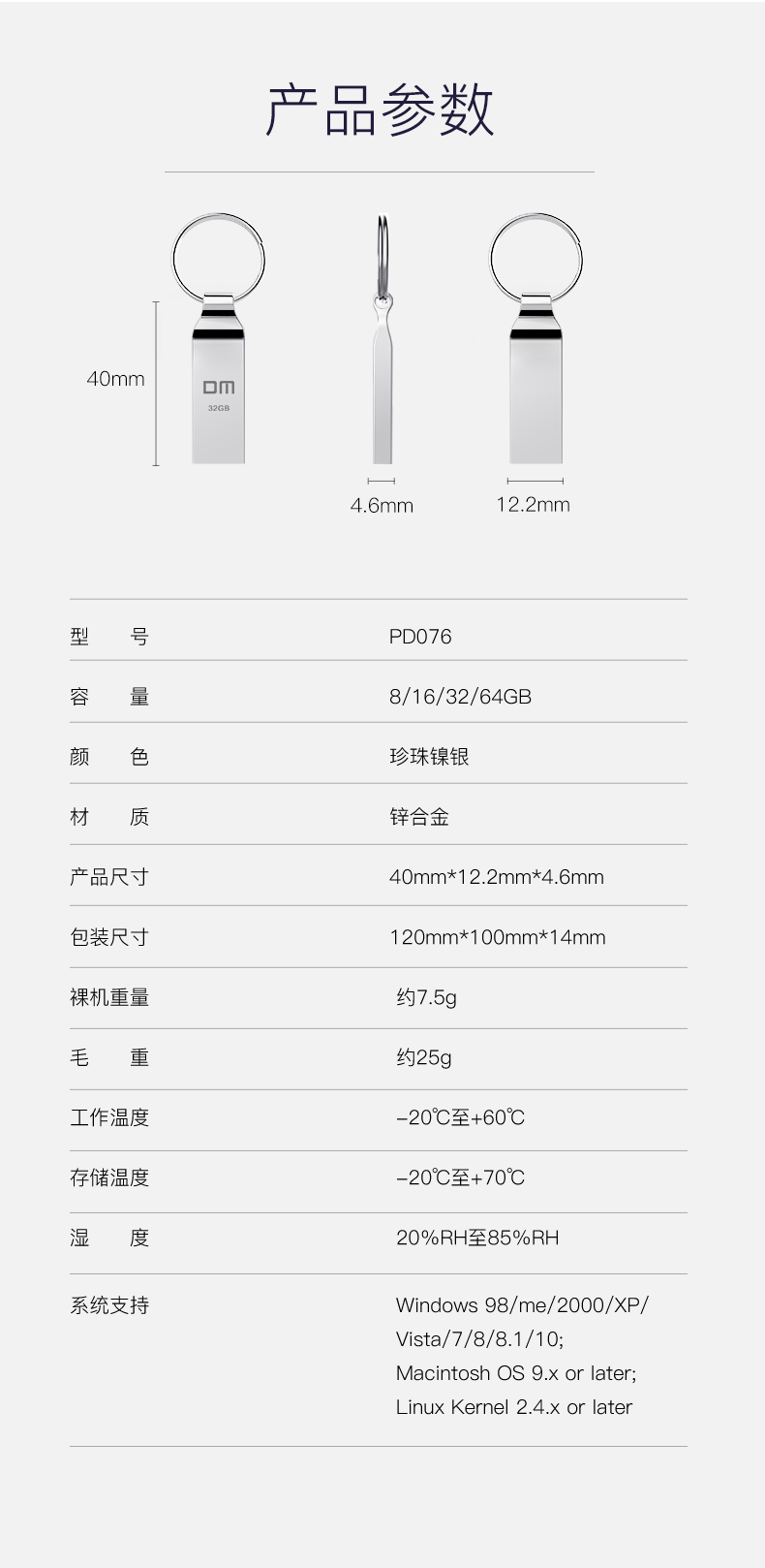 商品名称:大迈(DM) 32GB USB2.0 U盘 小风铃PD076系列 招标投标小u盘 防水防震电脑车载优盘