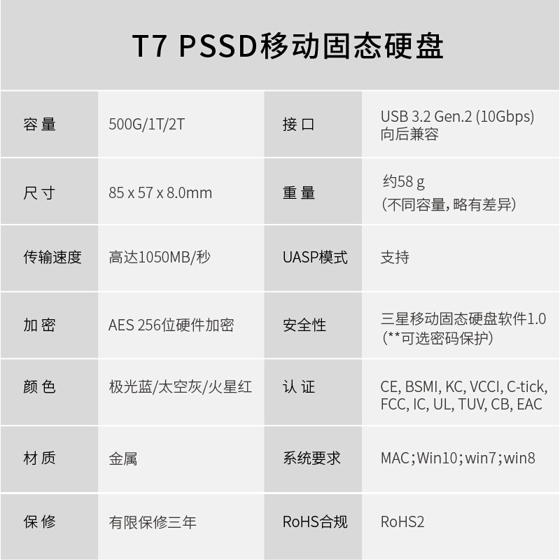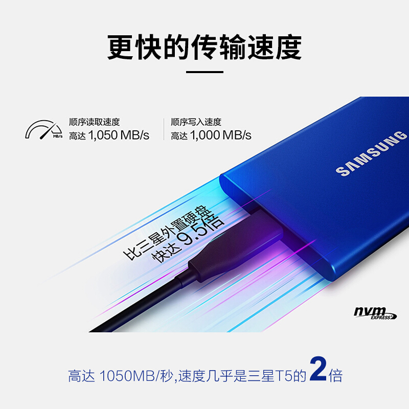 - 商品名称:三星(SAMSUNG) 1TB Type-c移动硬盘 固态PSSD T7 超极速NVMe高速传输1050MB/秒 太空灰MU-PC1T0T