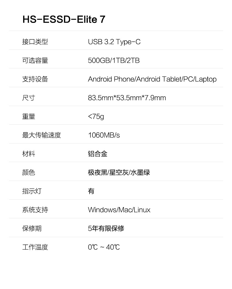 - 型号:HS-ESSD-ELITE7-水墨绿-500GB
