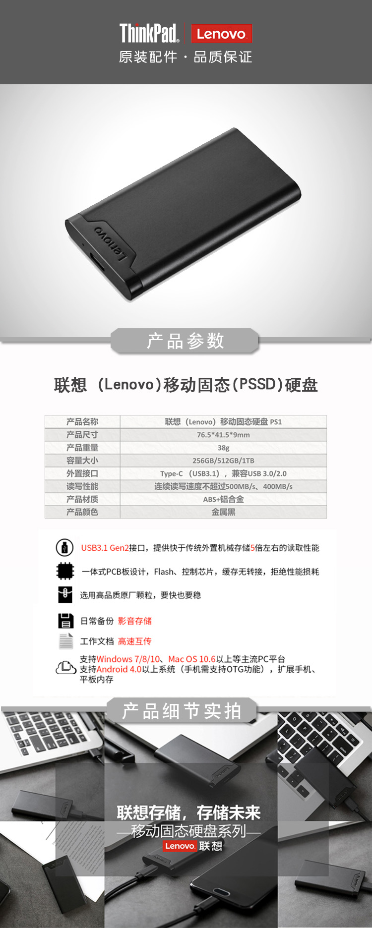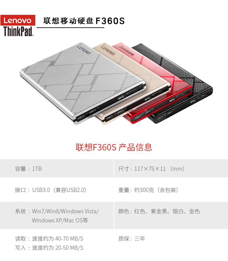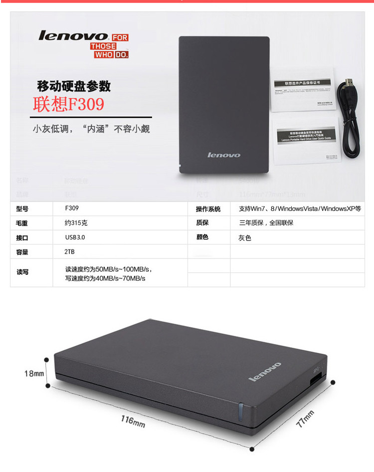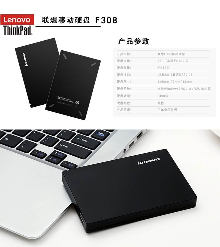 - 商品名称:联想LenovoUSB3.0 1T /2T/4T移动硬盘 高速商务移动硬盘128G/256G移动硬盘 F308 2T 黑色