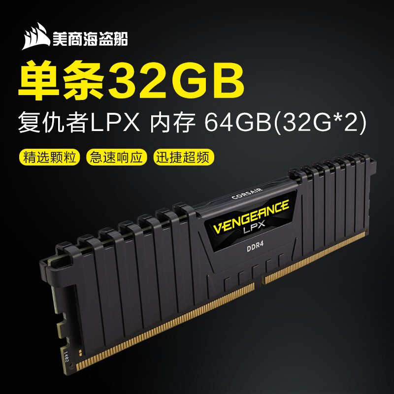 - 商品名称:美商海盗船(USCORSAIR) DDR4 3200 64GB(32G×2)套装 台式机内存条 复仇者LPX系列 游戏型