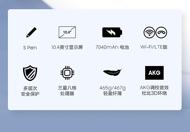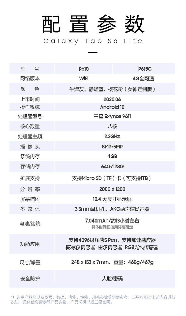 - 商品名称:三星平板电脑2020新款 Galaxy Tab S6 Lite 10.4英寸 SPEN影音娱乐游戏学习 4G+64G WiFi版 (静谧蓝) P610