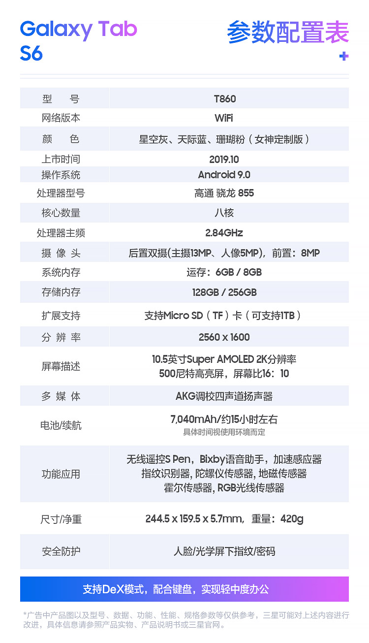 - 商品名称:三星Tab S6 10.5英寸平板电脑 [含键盘套装版]6G+128G WLAN版(骁龙855/手写SPen/指纹面部识别 )星空灰