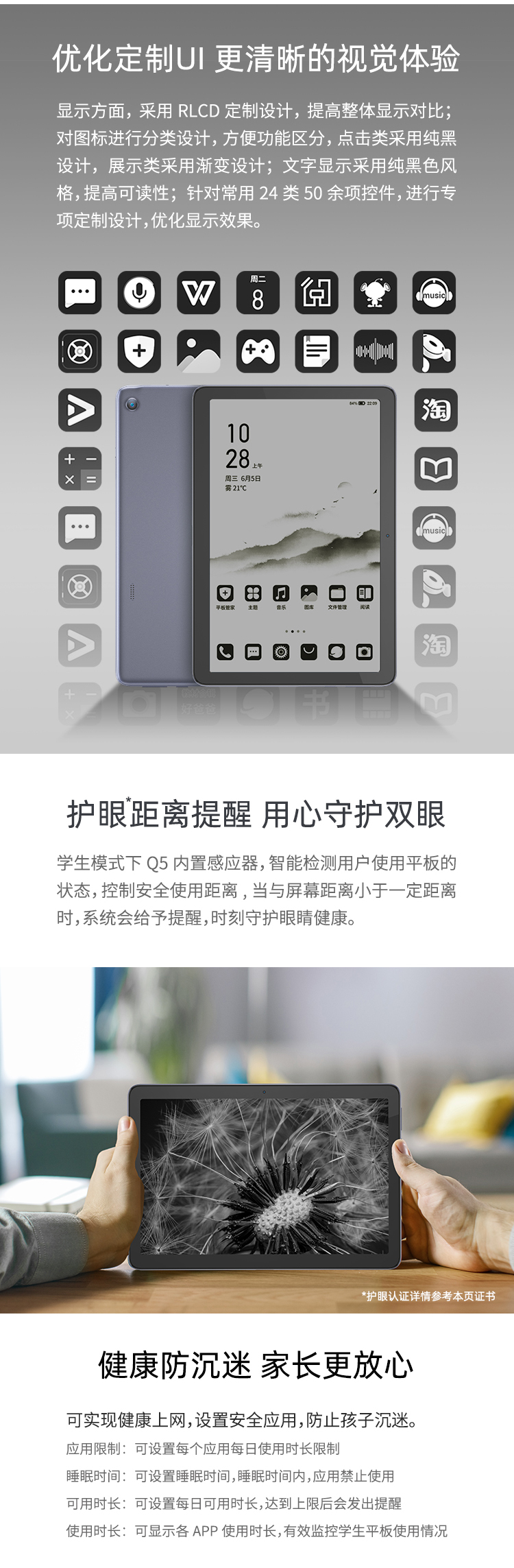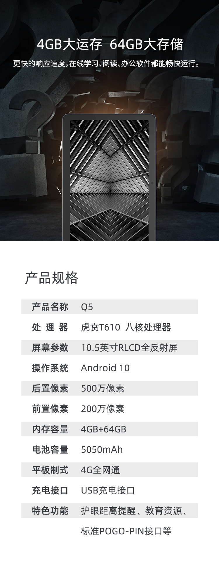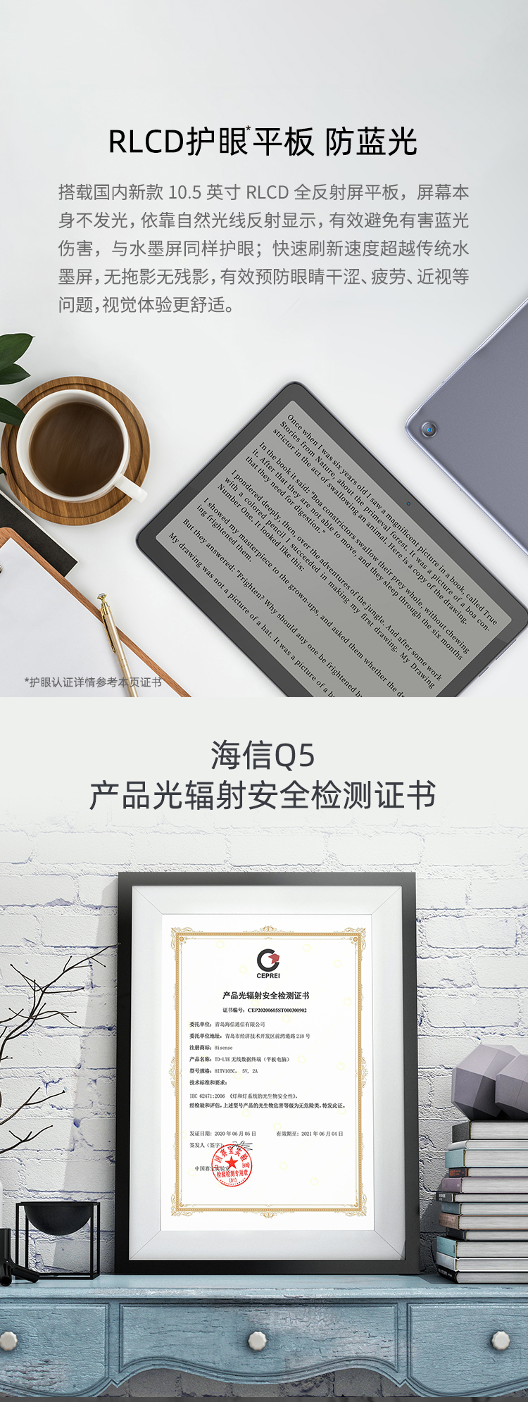 - 商品名称:海信 Q5 平板电脑 10.5英寸 RLCD屏 60Hz高刷类墨水屏八核 4G+64G全网通 4G LTE版电纸书 阅读器 电子纸 网课学习 商务办公